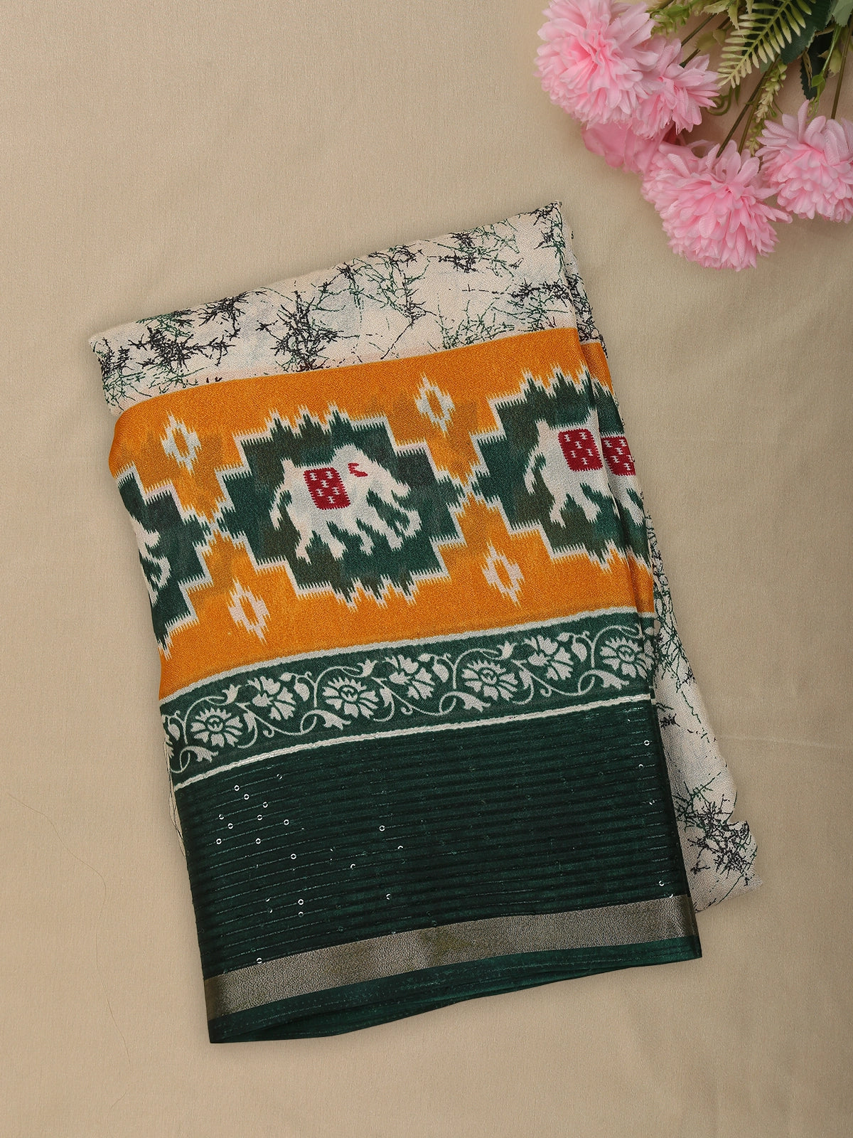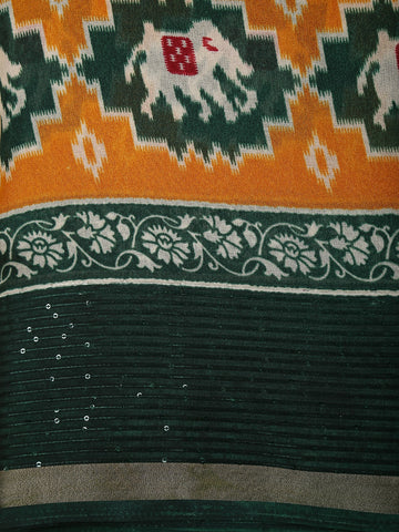 Enhancing the visual interest is the striking Ikat-inspired geometric panel in vibrant mustard orange and deep green, adorned with stylized motifs that add a bold traditional character to the saree. The geometric arrangement creates a beautiful contrast against the soft ivory body, making the design visually dynamic and unique.
