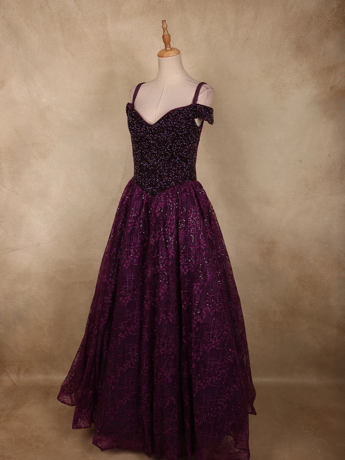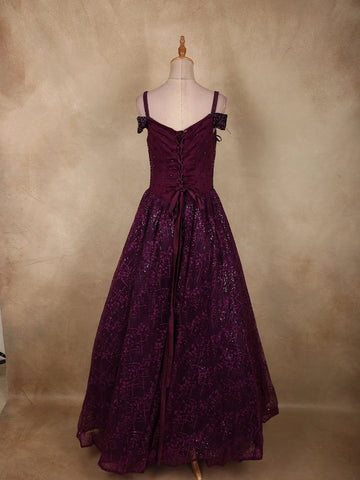 Make an unforgettable entrance in this Deep Plum Purple Net Gown, designed to exude glamour and refined elegance. The rich plum-toned base is intensified by a luxurious shimmer, creating a striking silhouette perfect for evening celebrations.