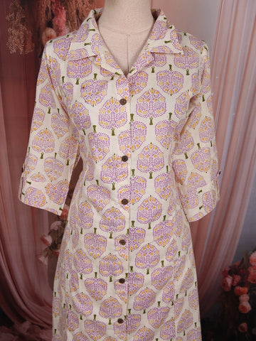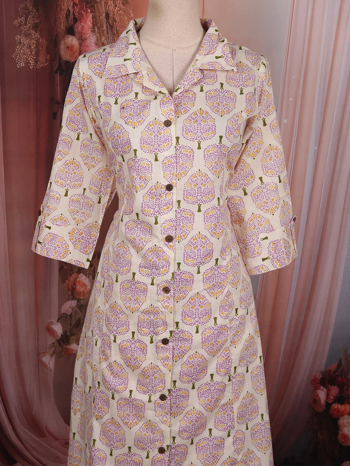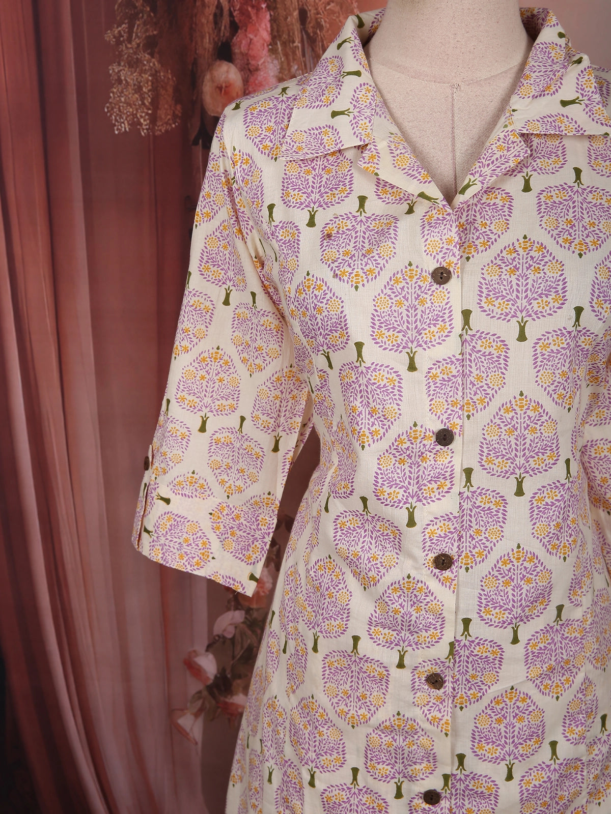 The kurta features a smart shirt-style collar with a front button-down design, adding a touch of contemporary sophistication to the traditional silhouette. The three-quarter sleeves enhance its structured appeal, while the all-over symmetrical leaf print gives the outfit a refined and balanced look.