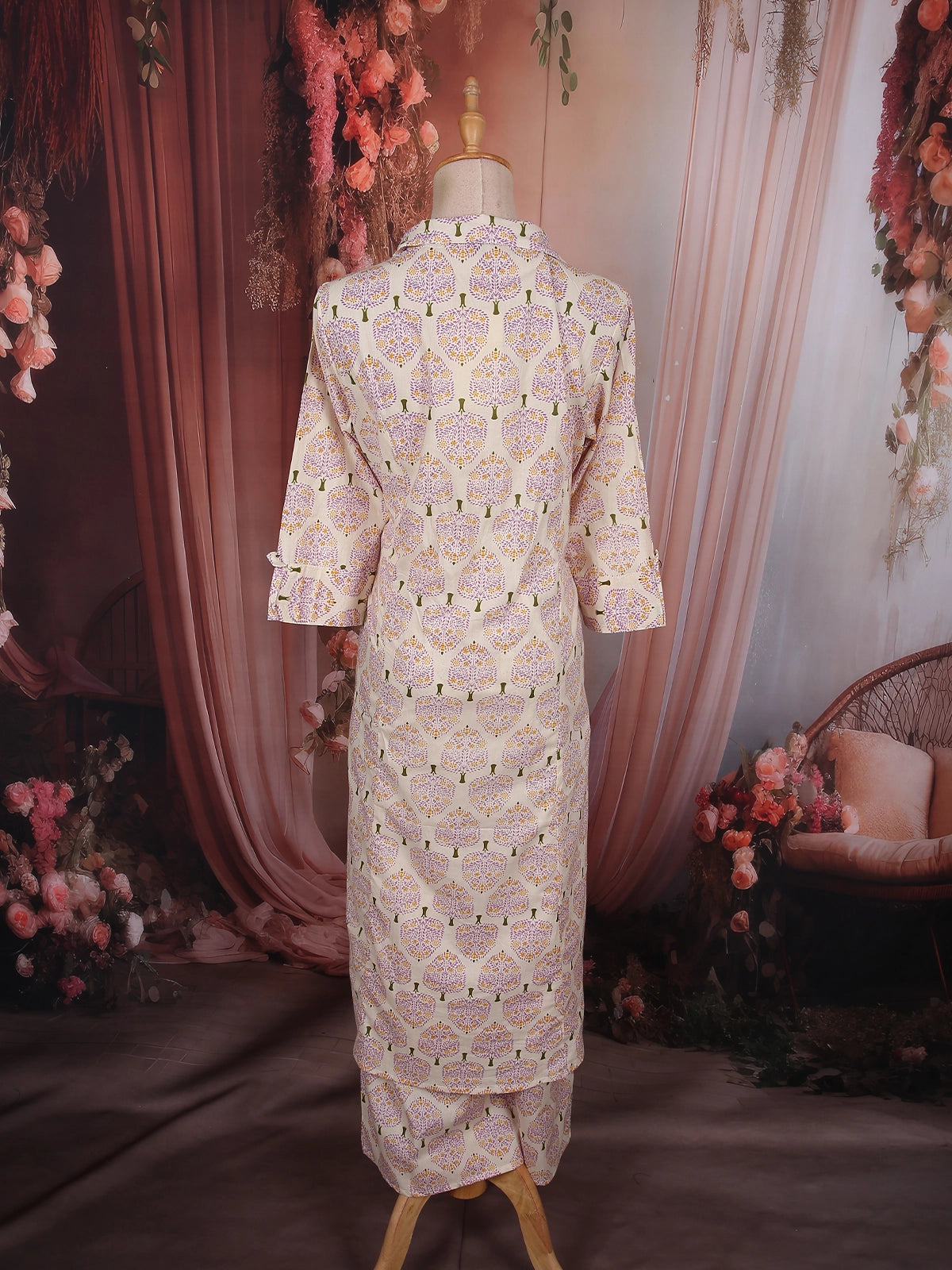 Elevate your everyday elegance with this beautifully crafted Soft Ivory Leaf Printed Design Cotton Palazzo Suit, designed for effortless comfort and graceful charm. The soothing ivory base is adorned with delicate leaf-inspired motifs in soft lavender and subtle mustard tones, creating a refreshing and serene aesthetic.
