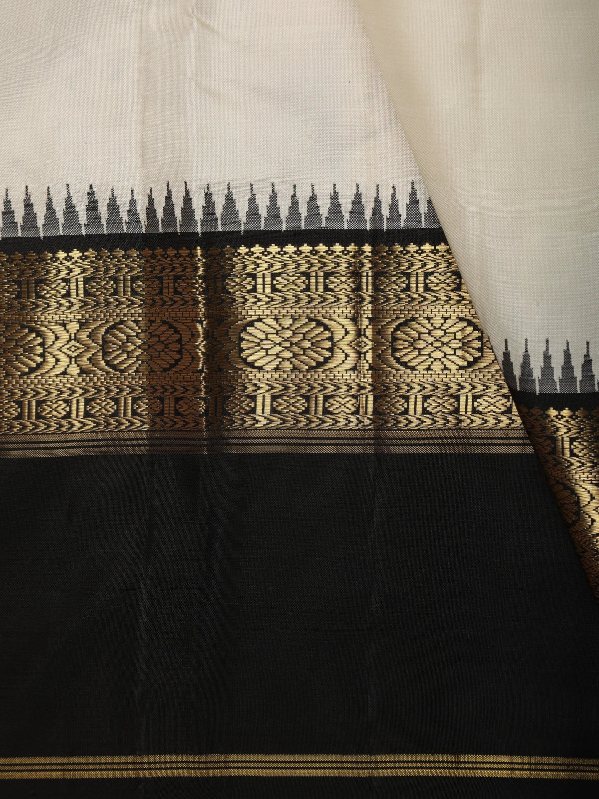 Soft Ivory White Woven Design Pure Kanchipuram Silk Saree with Contrast Temple Zari Border