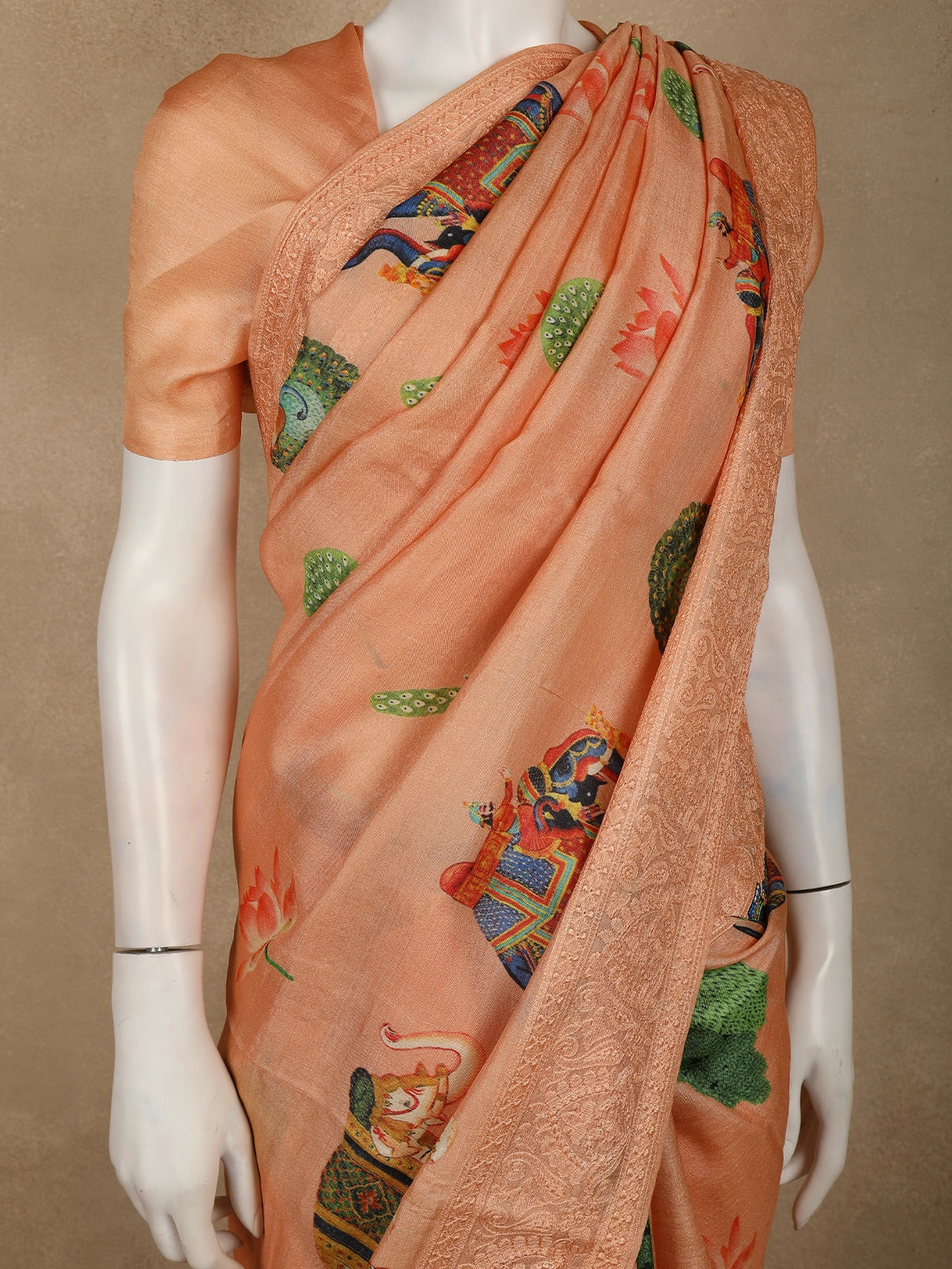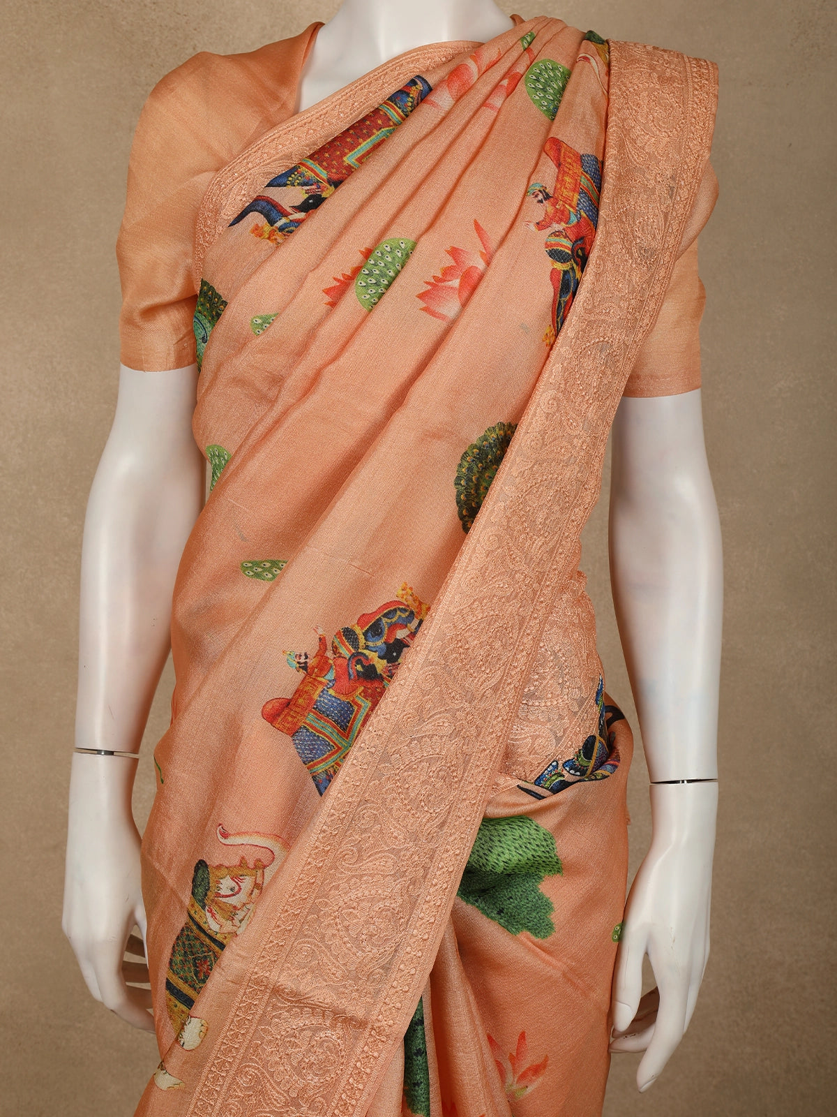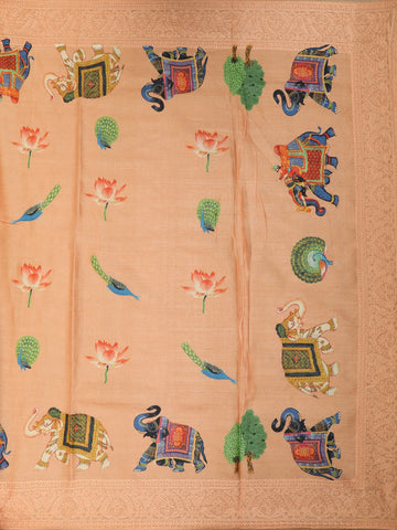 Soft Peach Floral and Peacock Woven Design Pure Tussar Saree with Elephant Woven Border
