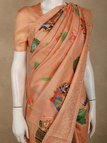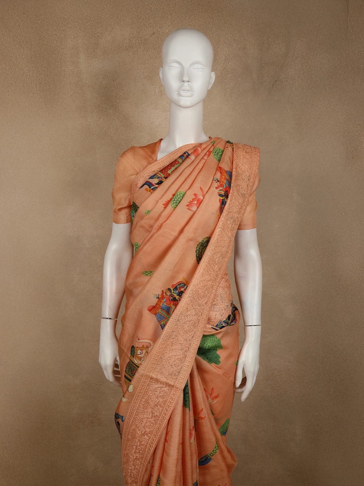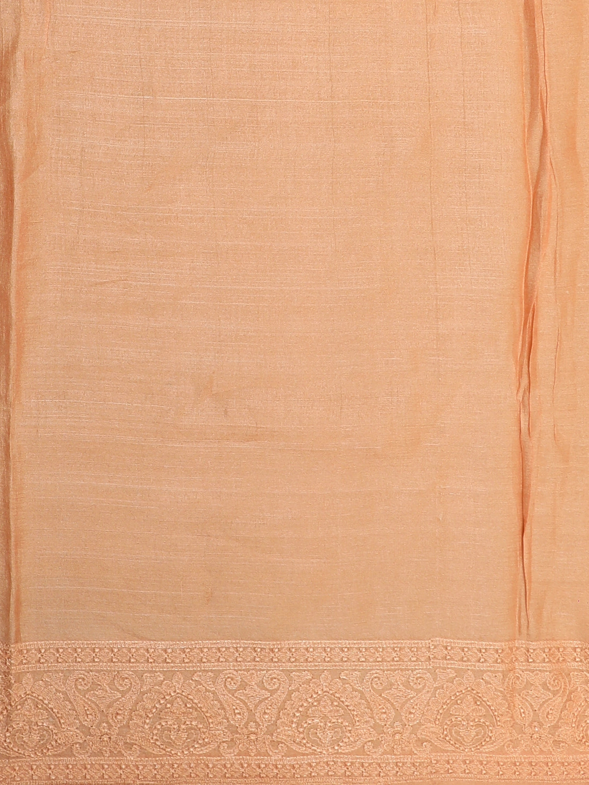 This Soft Peach Pure Tussar Silk Saree exudes graceful elegance with its soothing pastel tone and artistic woven detailing. The delicate soft peach hue lends a warm, refined charm, making it an ideal choice for daytime festivities and elegant occasions.