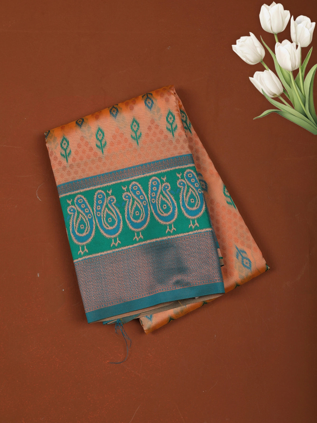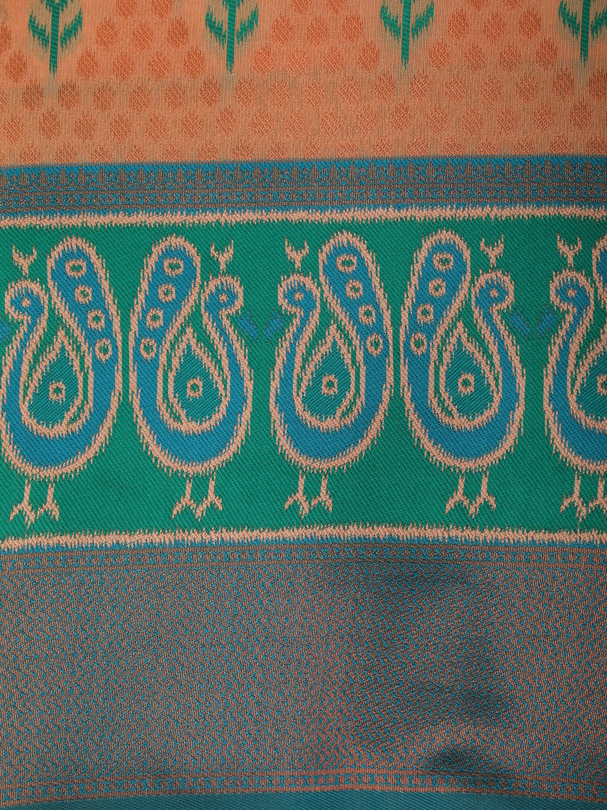 Soft Peach Ikat Zari Woven Design Art Silk Saree with Contrast Peacock Zari Border