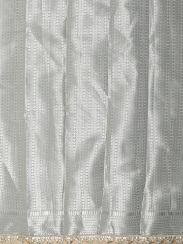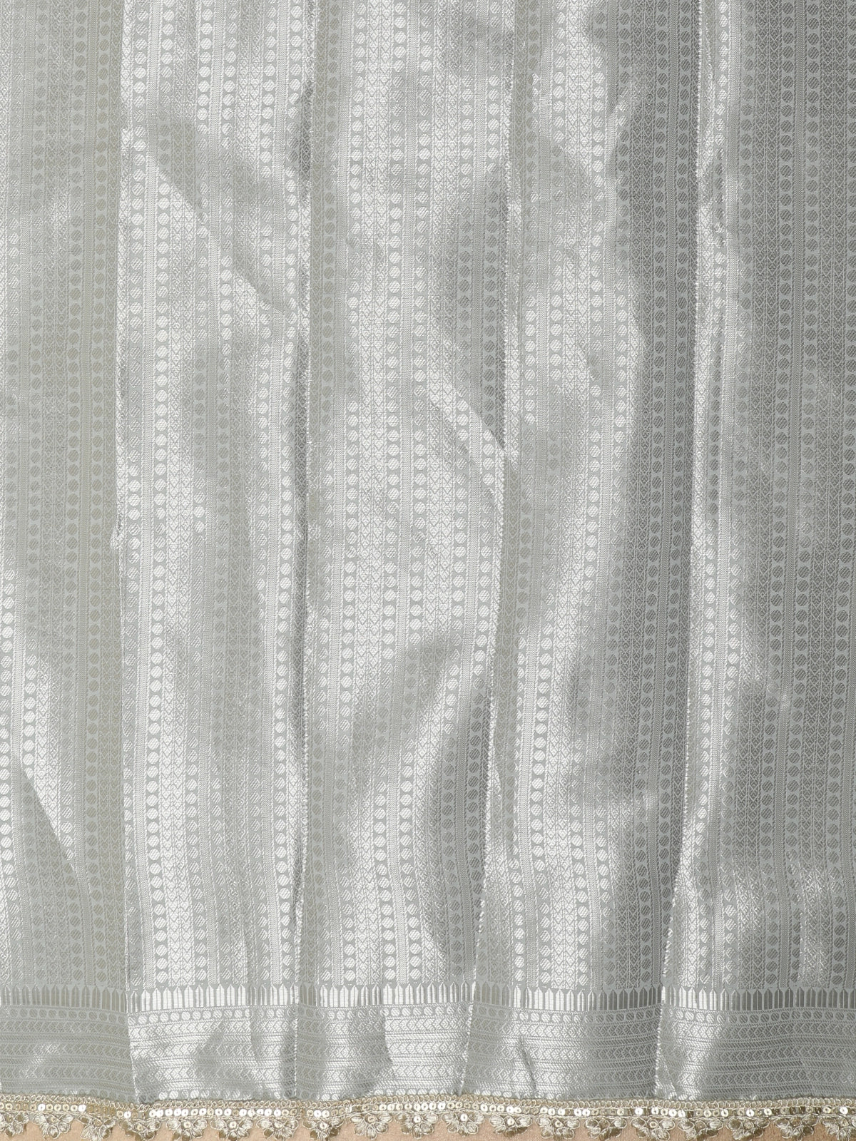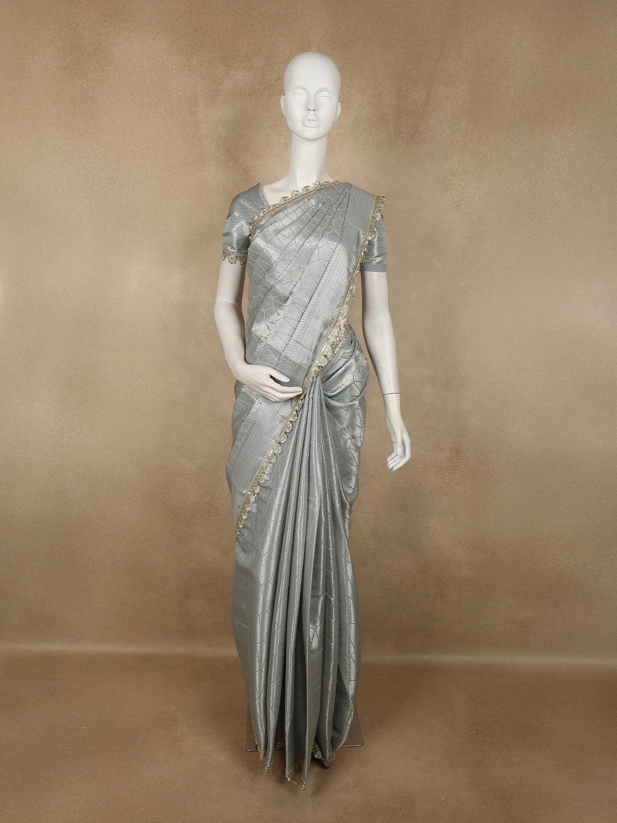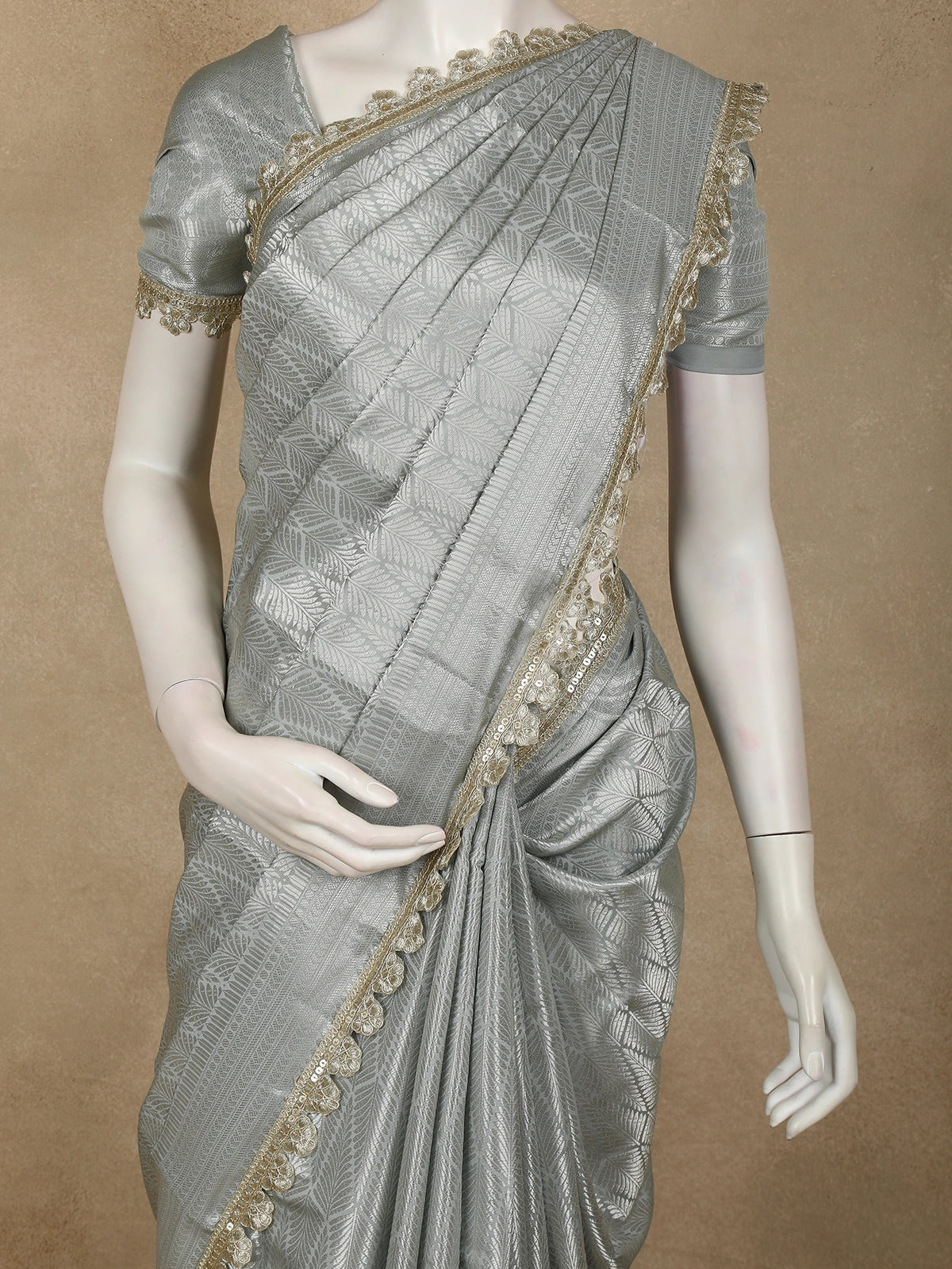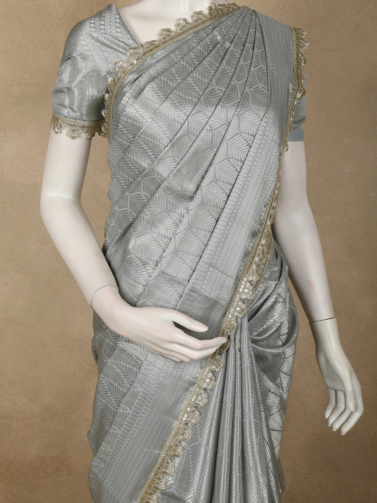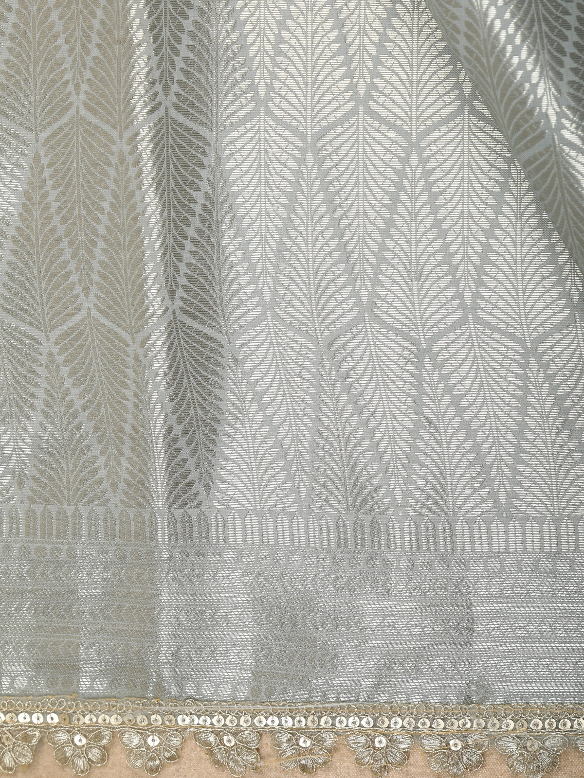Soft Pearl Silver Grey Leaf Zari Woven Design Tissue Designer Saree with Sequins Border