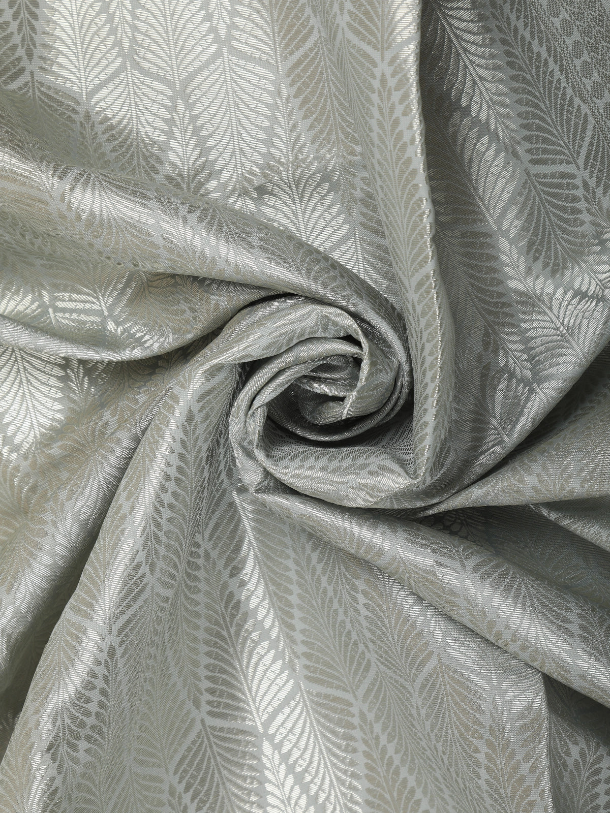 Exuding understated luxury, this Soft Pearl Silver Grey Tissue Designer Saree is a timeless expression of elegance and grace. The luminous pearl-silver base is delicately enhanced with leaf-inspired zari woven motifs, creating a refined texture that subtly catches the light with every movement.