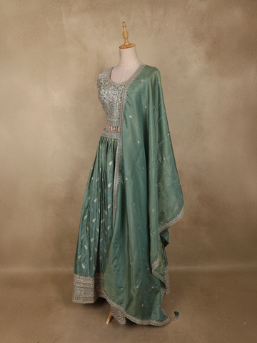 Complementing the lehenga is a matching sage green dupatta, highlighted with scattered embroidered buttas and a finely detailed embroidered border. Draped effortlessly, it adds softness and balance to the richly worked outfit.