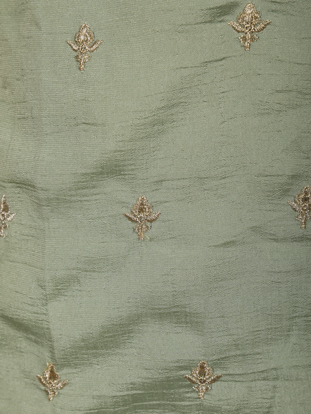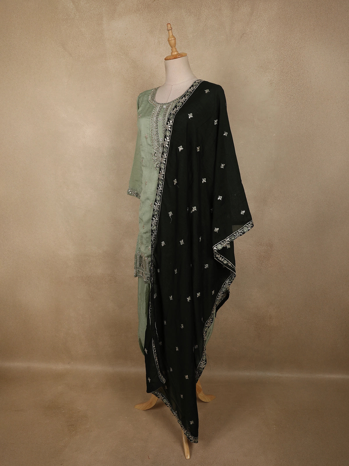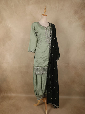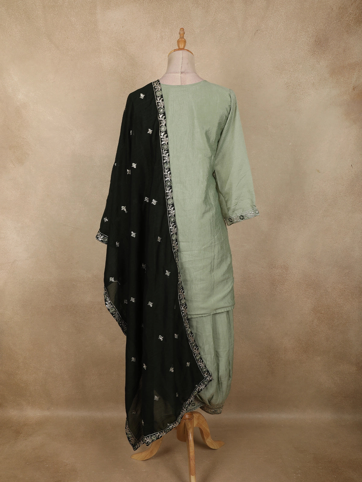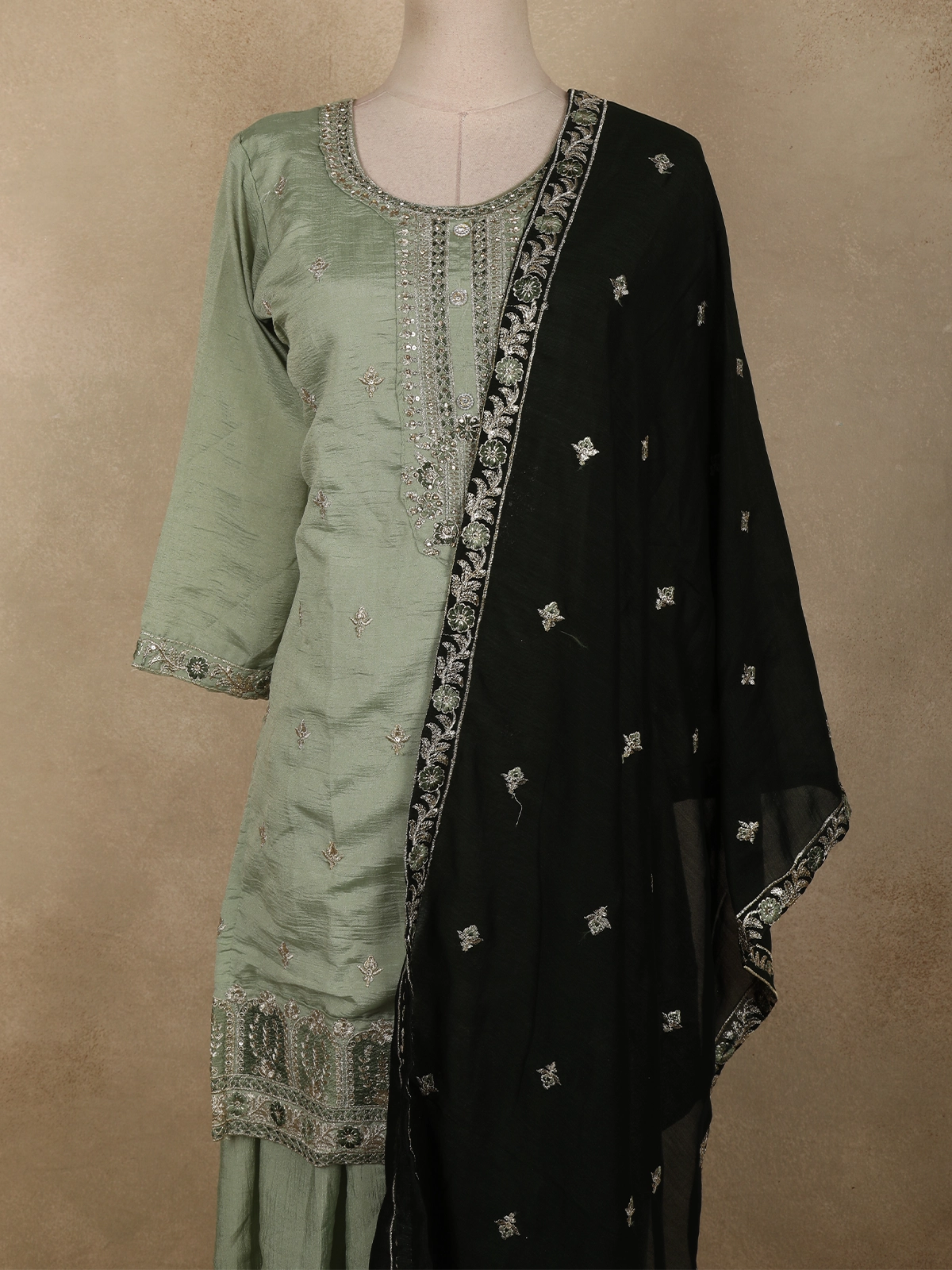 Soft Sage Green Floral Embellished Design Silk Palazzo Suit with Contrast Dupatta