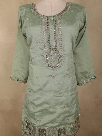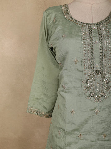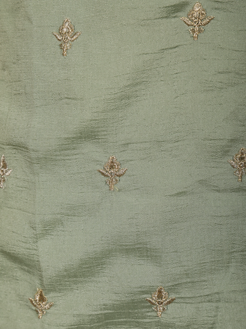 Exude refined elegance with this soft sage green silk palazzo suit, designed to blend subtle sophistication with festive charm. The kurta features delicate floral sequin and thread embellishments scattered gracefully across the fabric, lending a soft shimmer without overpowering the look.