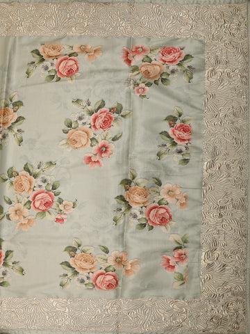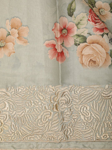 Accentuated with a subtle woven border, the saree carries a refined finish that enhances its overall sophistication without overpowering the design. The floral motifs flow effortlessly across the body, lending a soft, romantic look that suits both daytime elegance and understated festive occasions.
