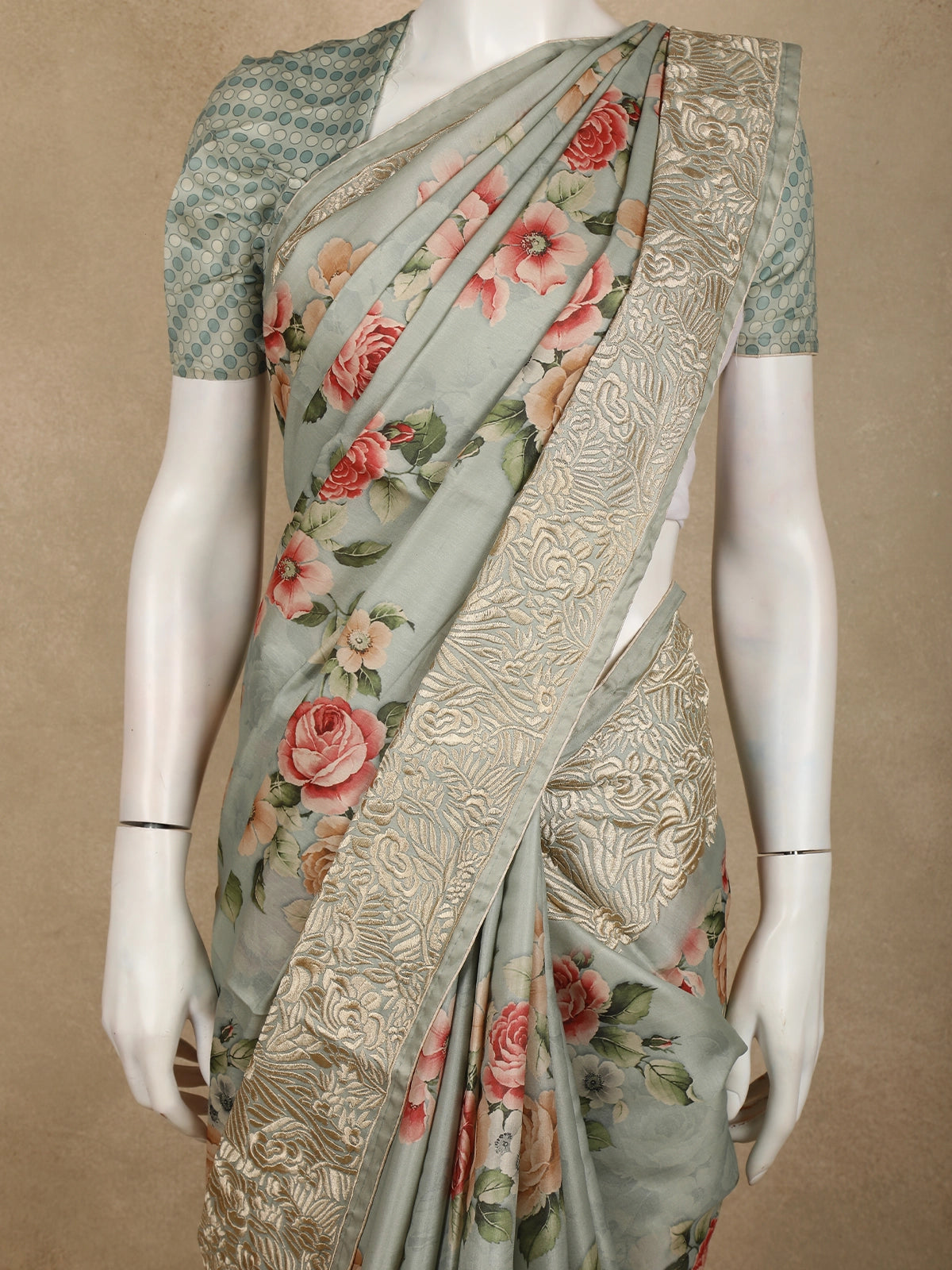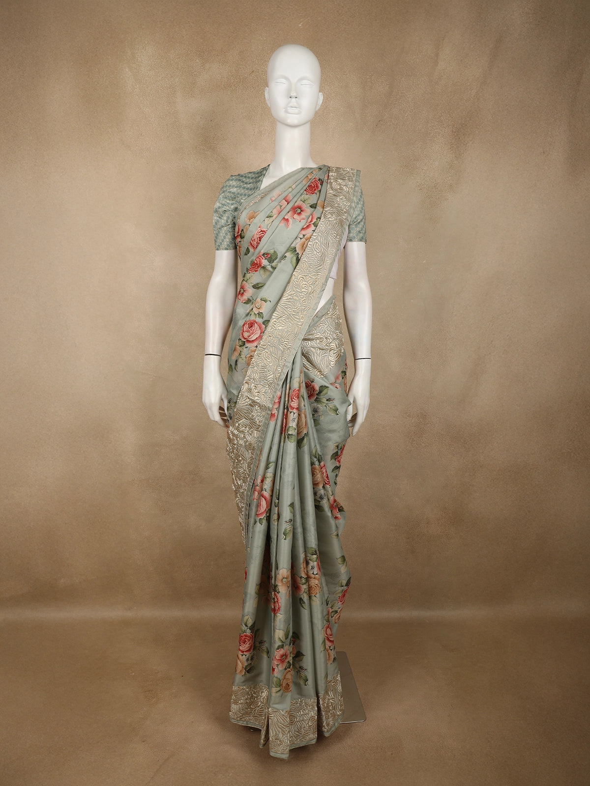 Perfect for festive gatherings, daytime weddings, cultural events, and elegant casual wear, this saree pairs beautifully with minimal jewellery and classic styling. A timeless piece for women who love muted tones, floral artistry, and effortless grace.