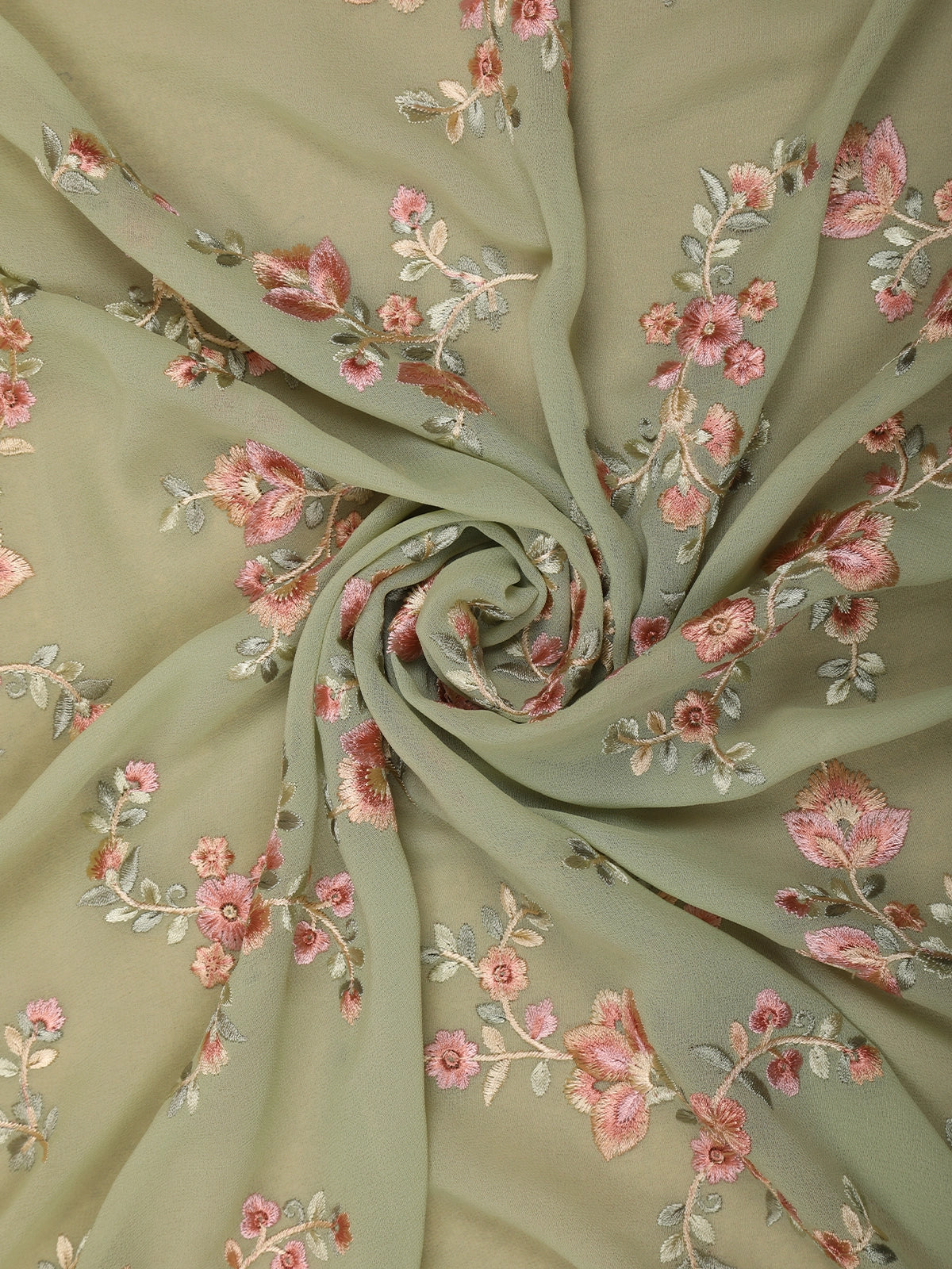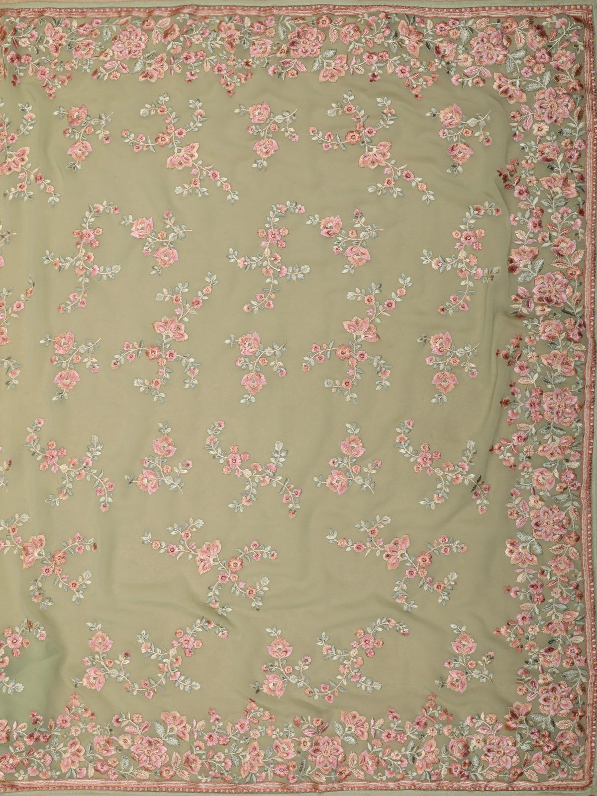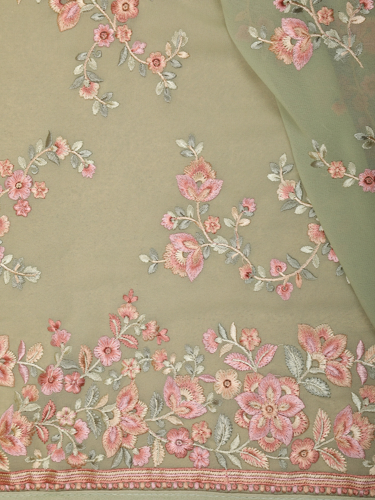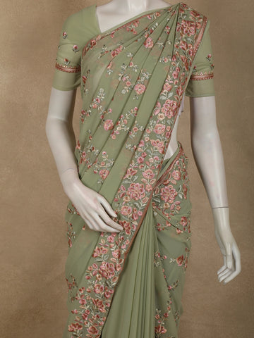 Soft Sage Green Floral Thread Embroidered Design Chiffon Fancy Saree