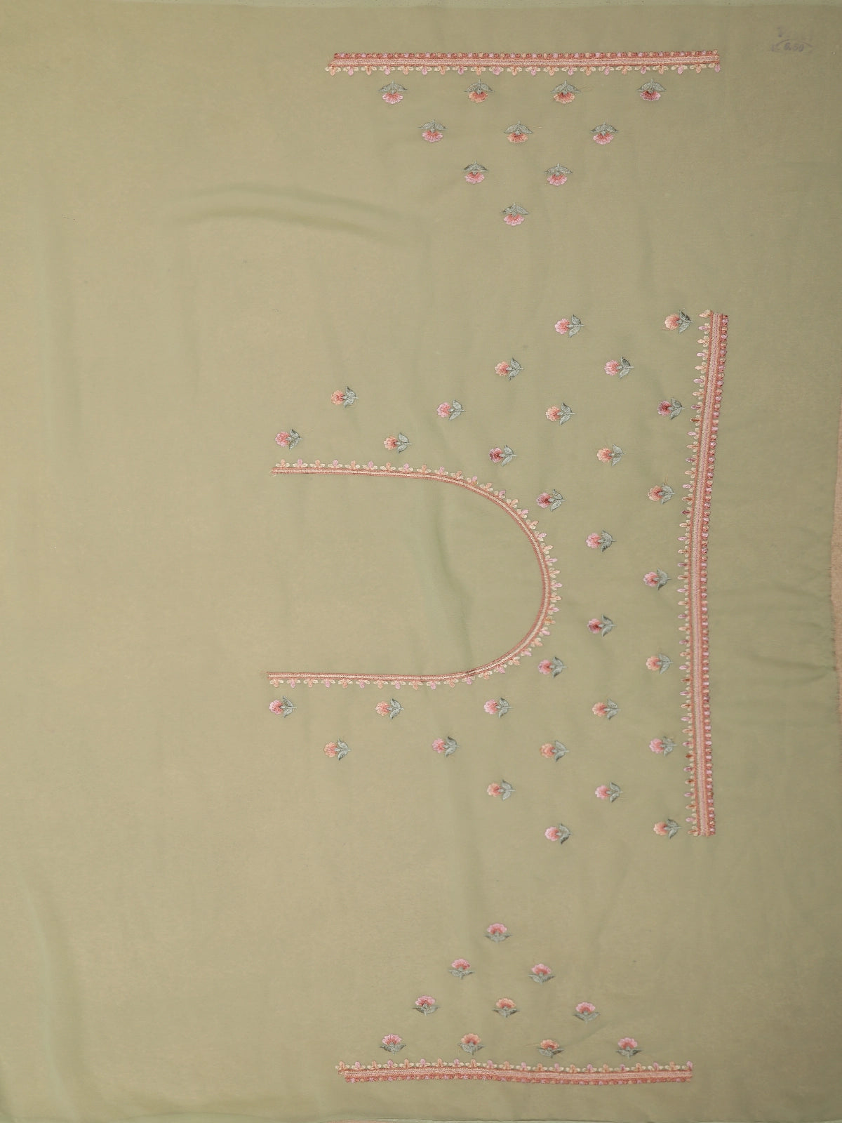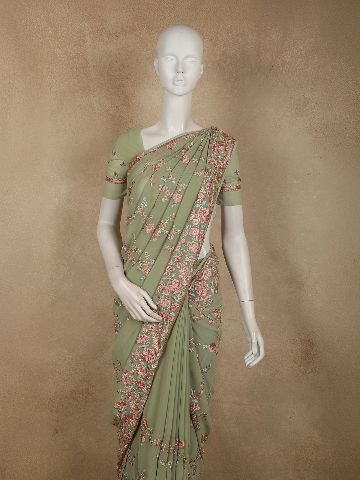 This exquisite chiffon saree is crafted in a soft Sage Green hue, radiating a delicate and romantic charm. The gentle blush undertones create an elegant, feminine base that feels light, airy, and timeless. Adorned across the body are fine floral thread embroidery motifs, intricately worked in antique gold, champagne beige, and subtle ivory threads, adding refined texture and a graceful shimmer.