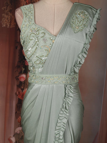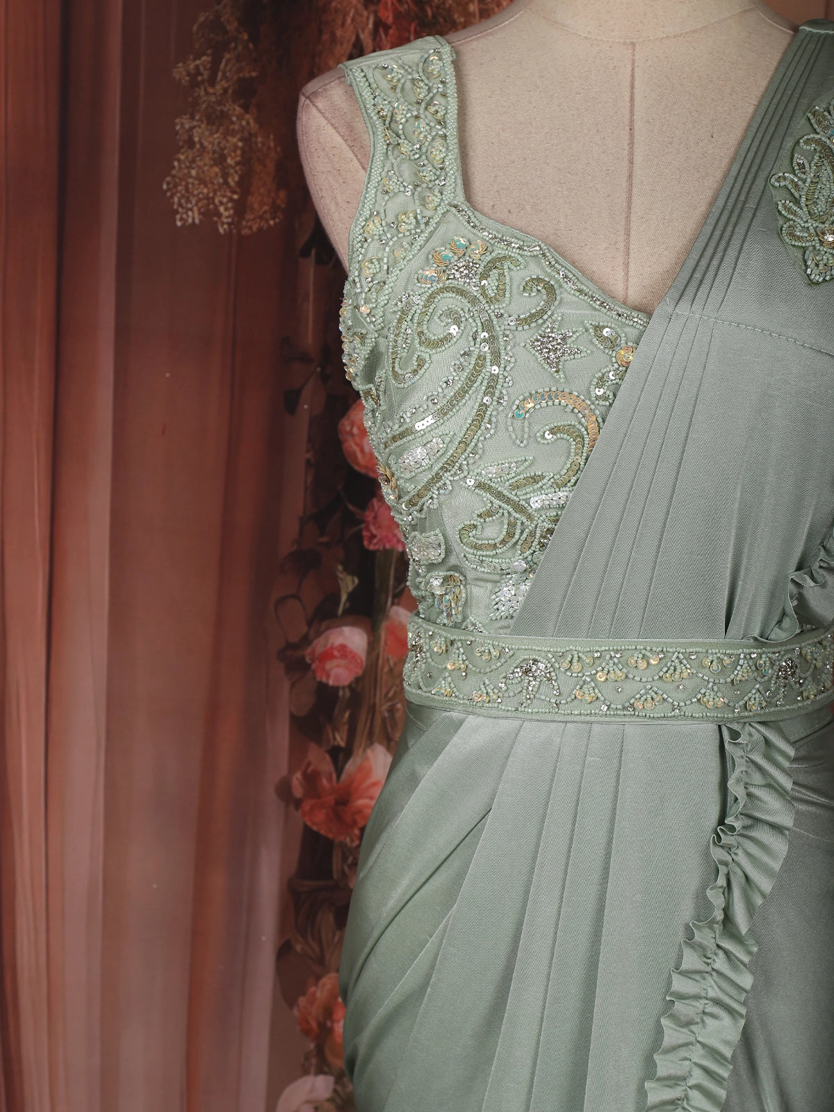 Soft Sage Green Heavy Sequins and Beads Embroidered Design Satin Ready To Wear Saree with Designer Blouse