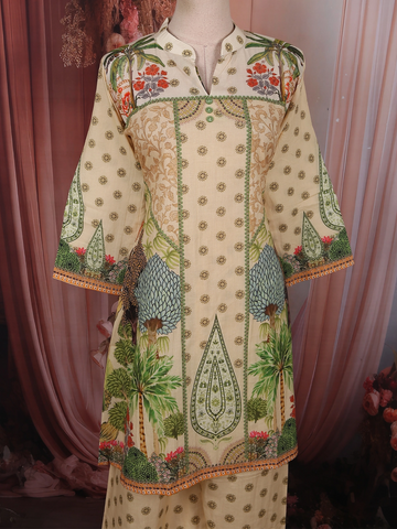 Crafted from breathable premium cotton, this outfit ensures all-day comfort without compromising on style. The three-quarter sleeves feature coordinated printed borders, adding balance to the overall design. The matching palazzo continues the subtle printed detailing with a coordinated hem border, offering a polished and cohesive finish.