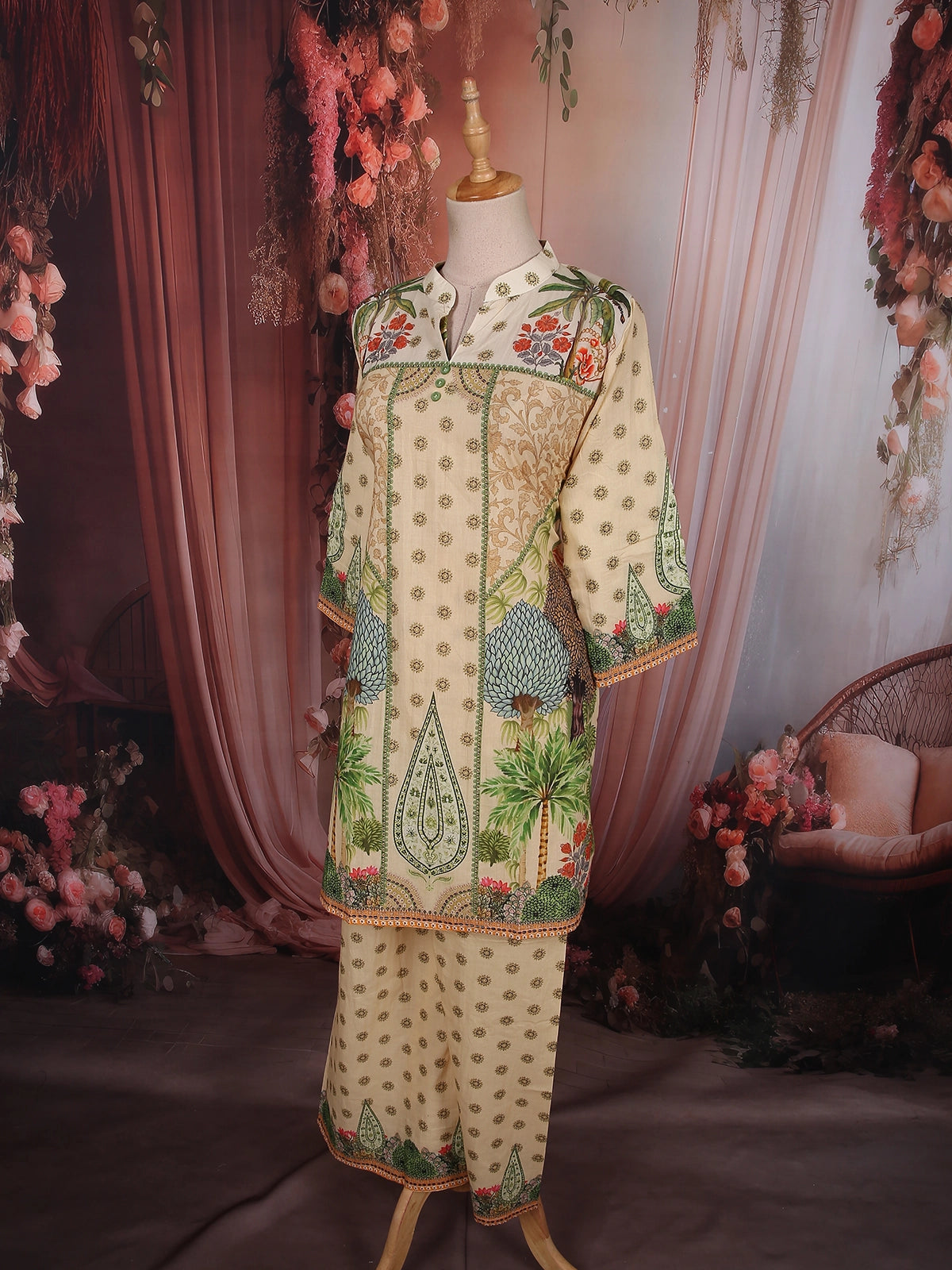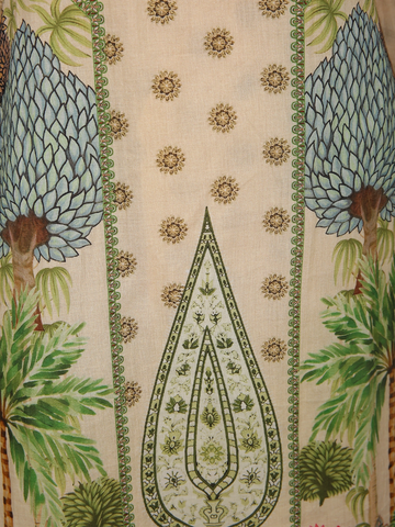 Graceful, refreshing, and inspired by nature’s elegance, this Soft Sand Beige Cotton Palazzo Suit is a perfect blend of comfort and statement artistry. Designed in a soothing beige tone, the ensemble features intricate botanical prints in refreshing shades of leaf green, soft coral, and subtle earthy accents, creating a harmonious and eye-catching look.