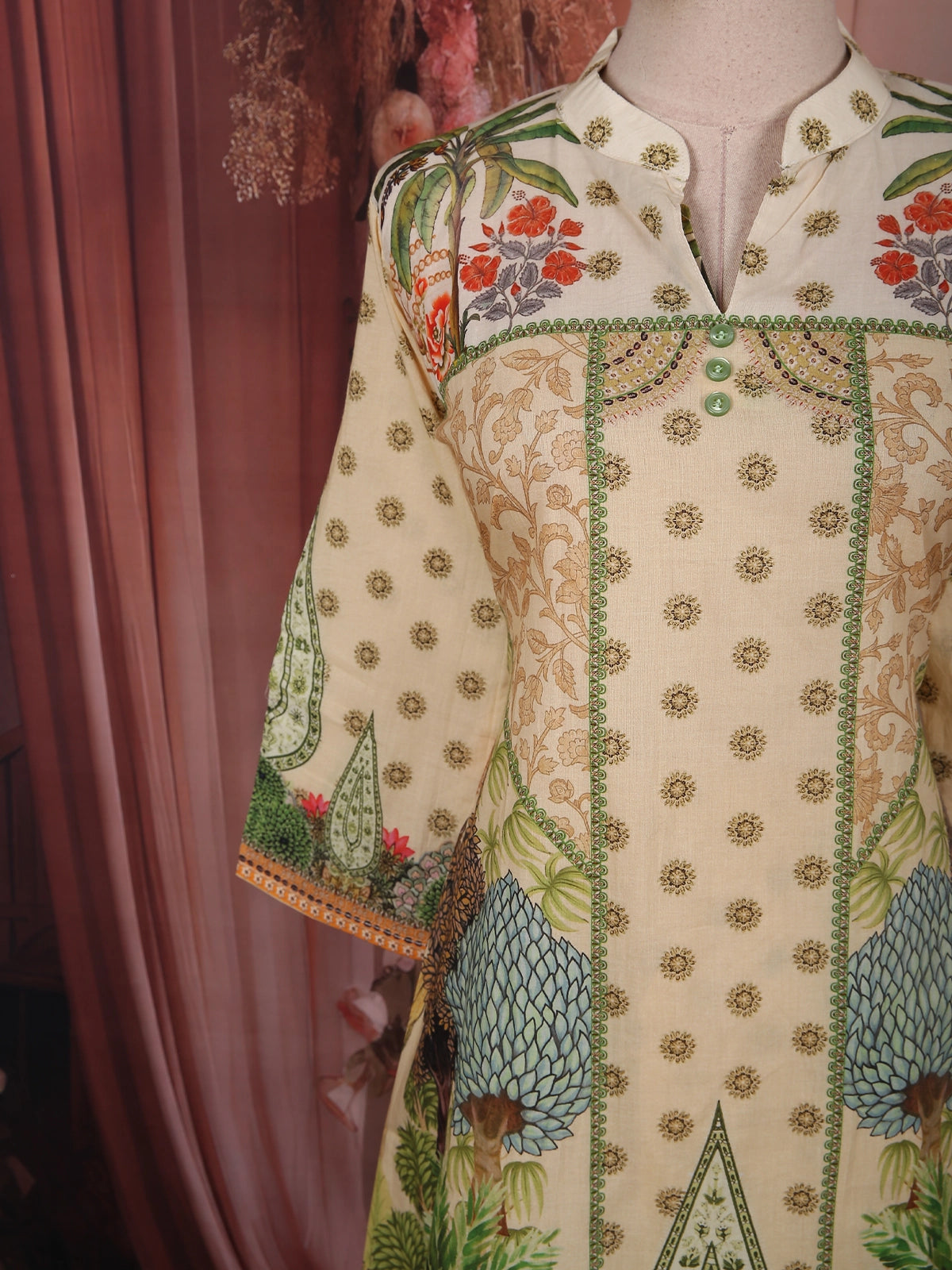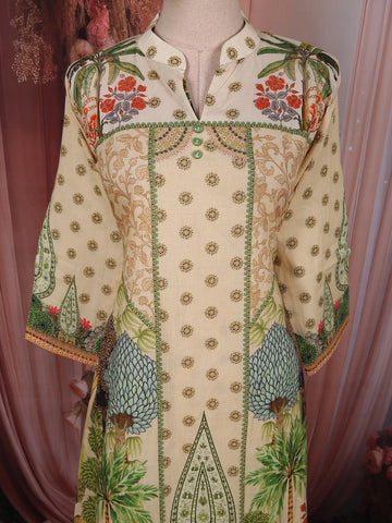 The kurta showcases delicate all-over butta prints complemented by beautifully placed botanical motifs along the hem and panels. The structured front design with contrast green piping enhances the silhouette, while the mandarin collar with a notch opening adds a refined and contemporary touch.
