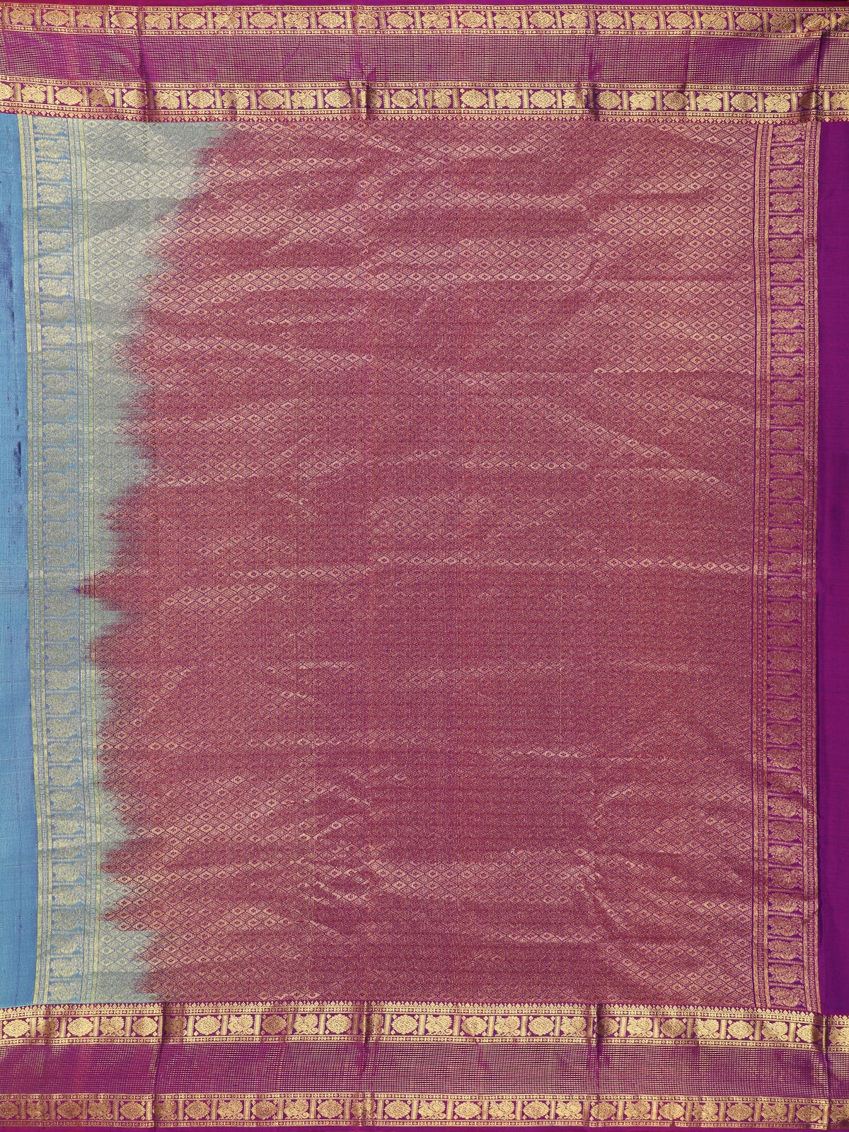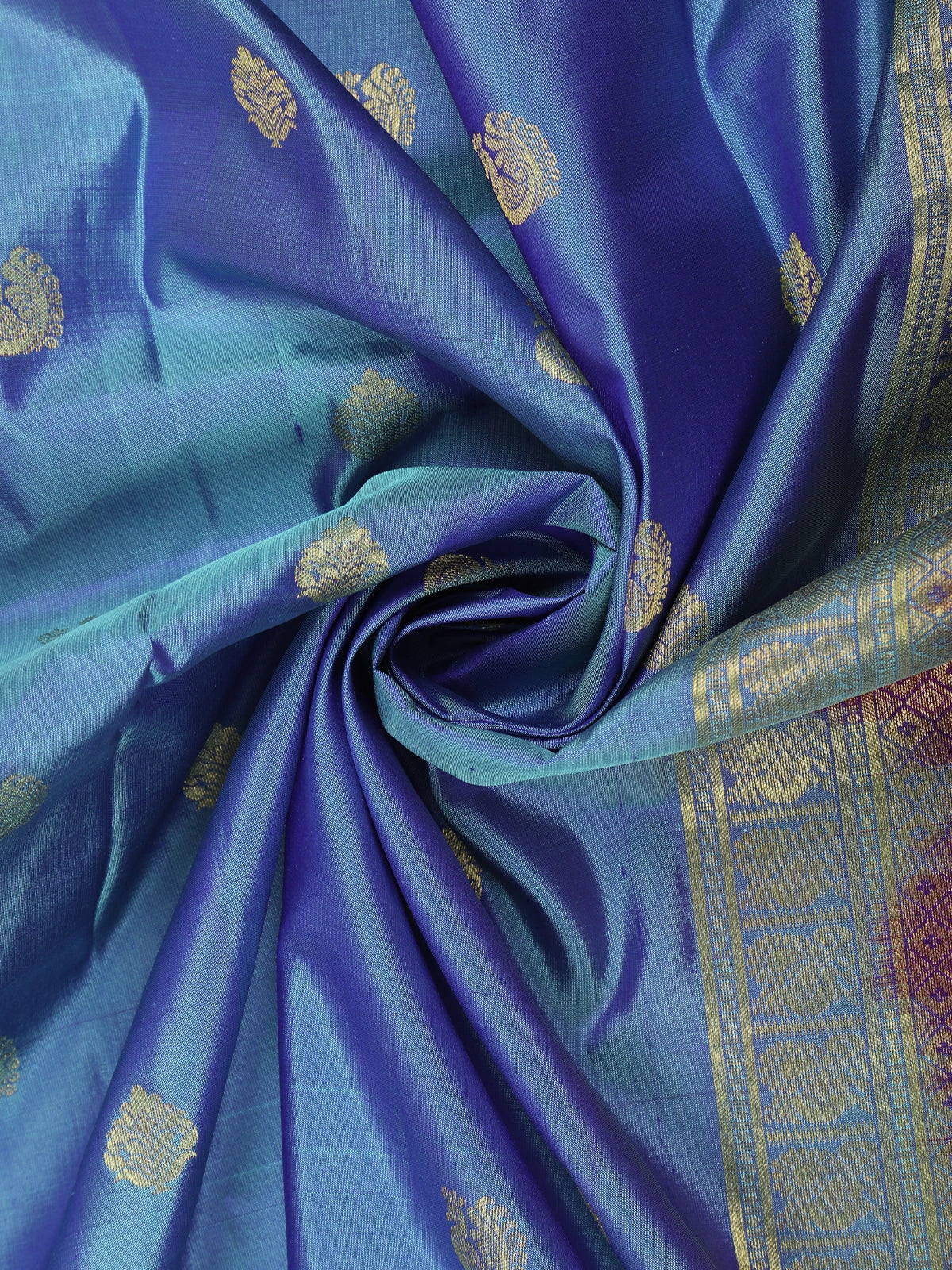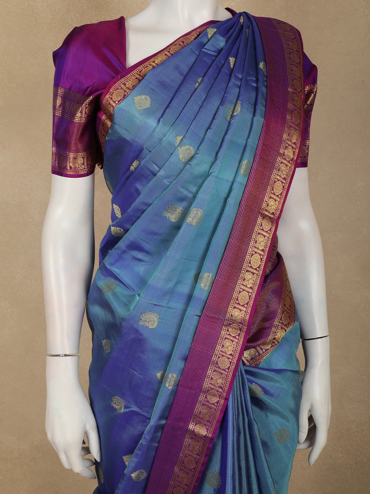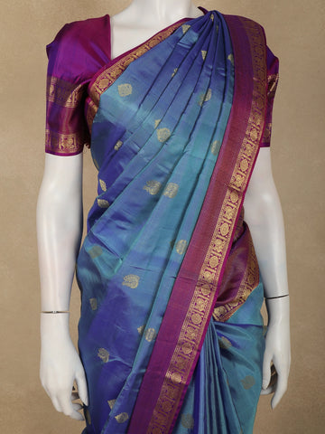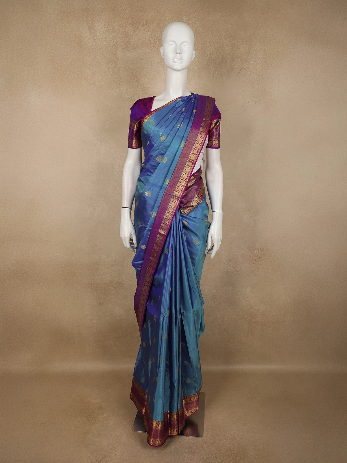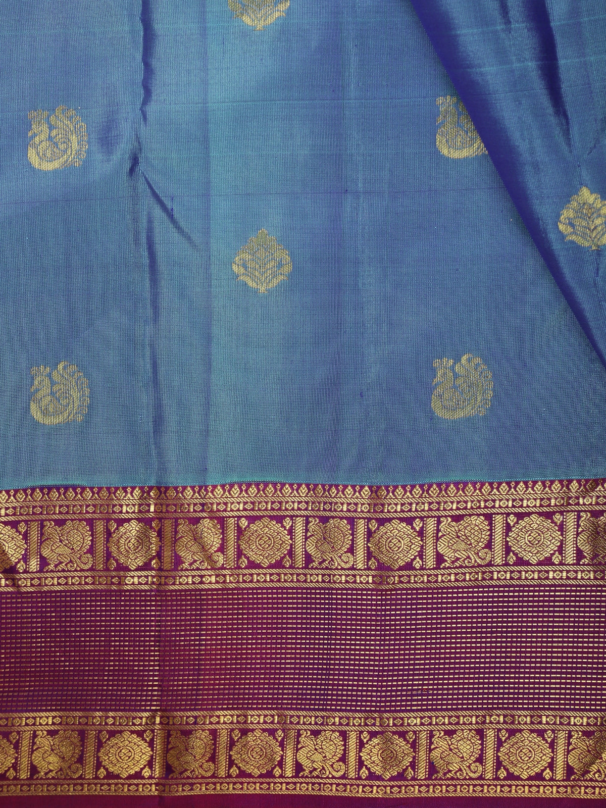 Steel Blue Peacock Butta Woven Design Kanchipuram Silk Saree with Contrast Zari Border