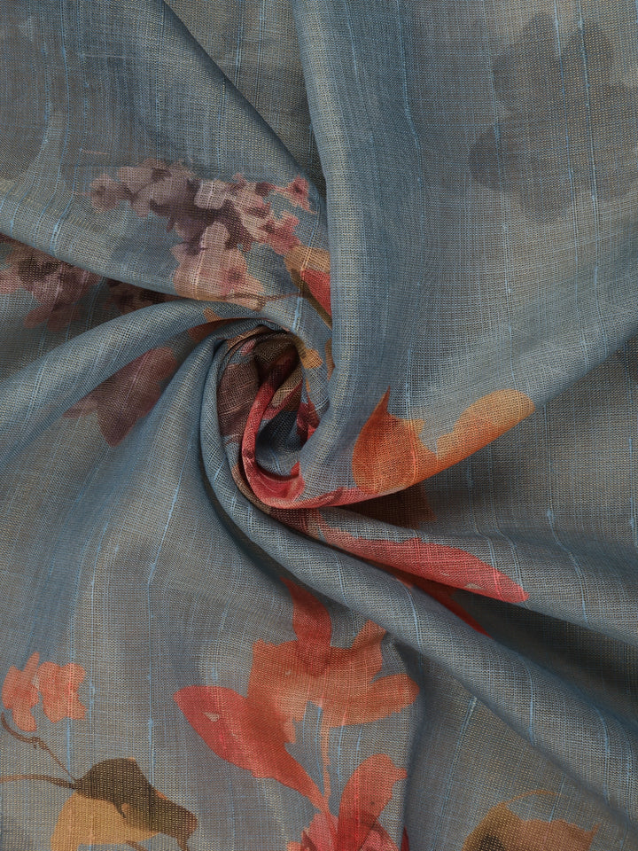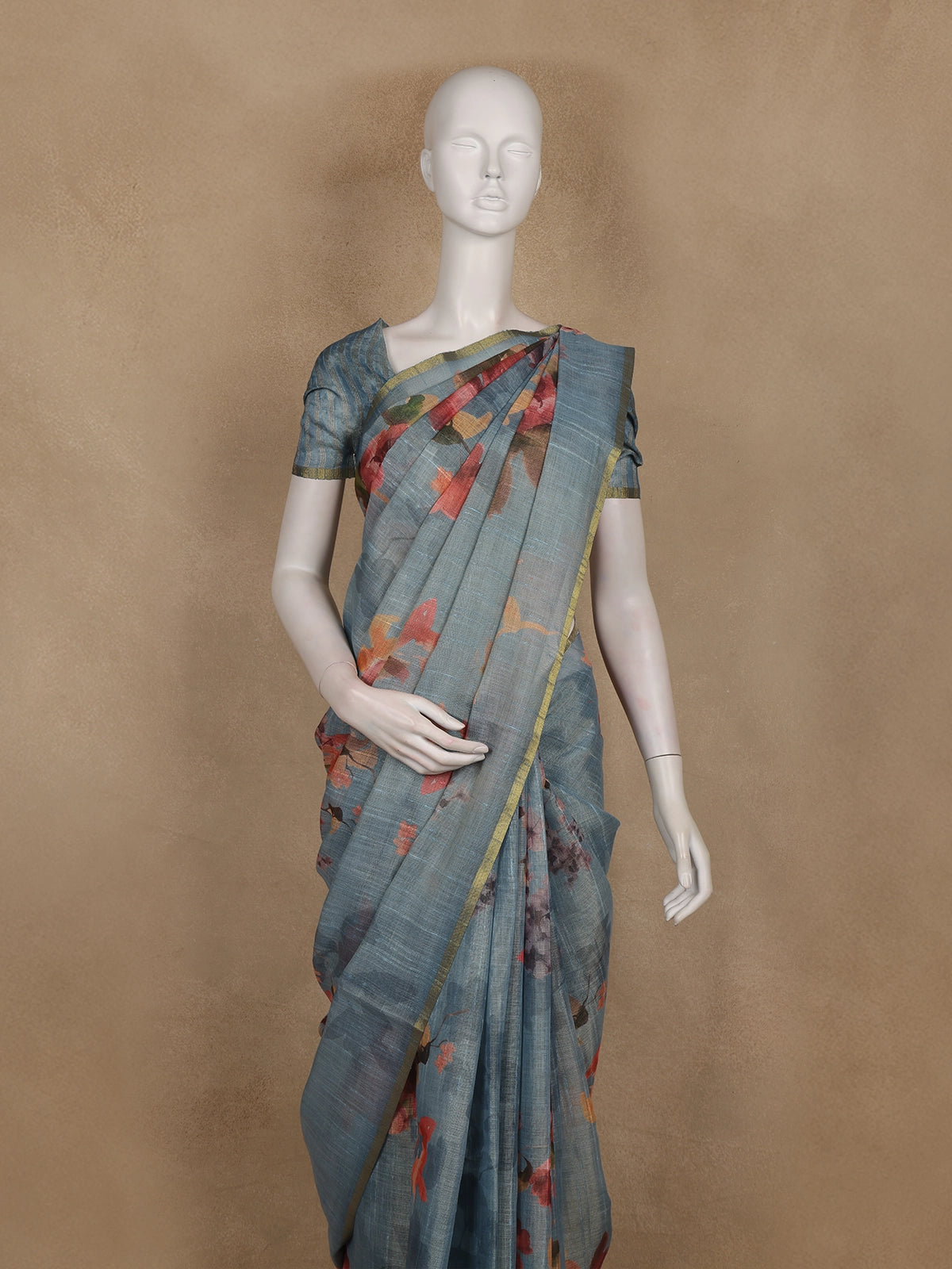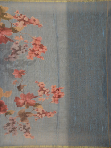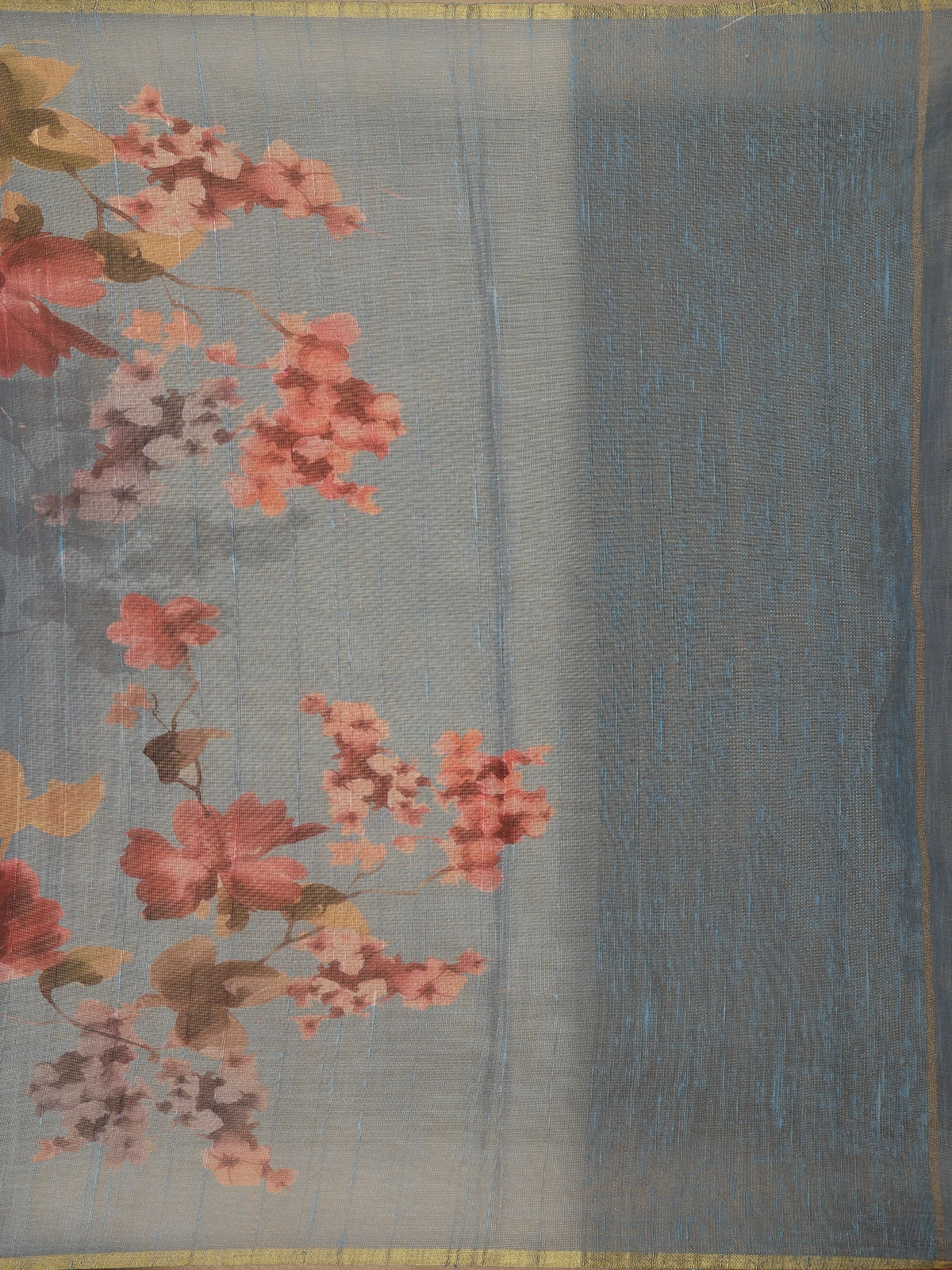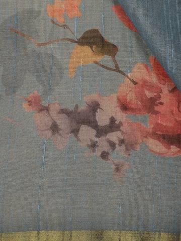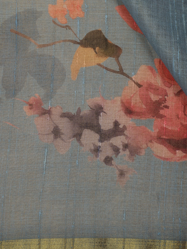 Steel Blue Floral Printed Cotton Saree with Subtle Golden Zari Border