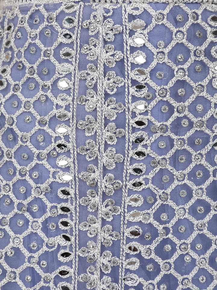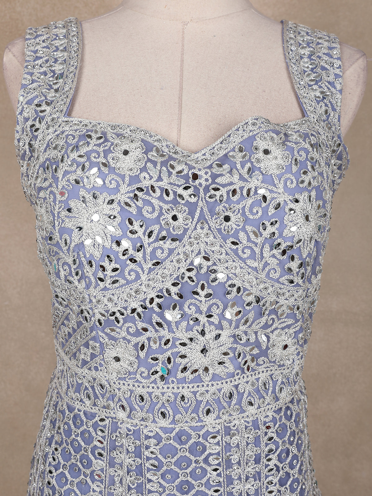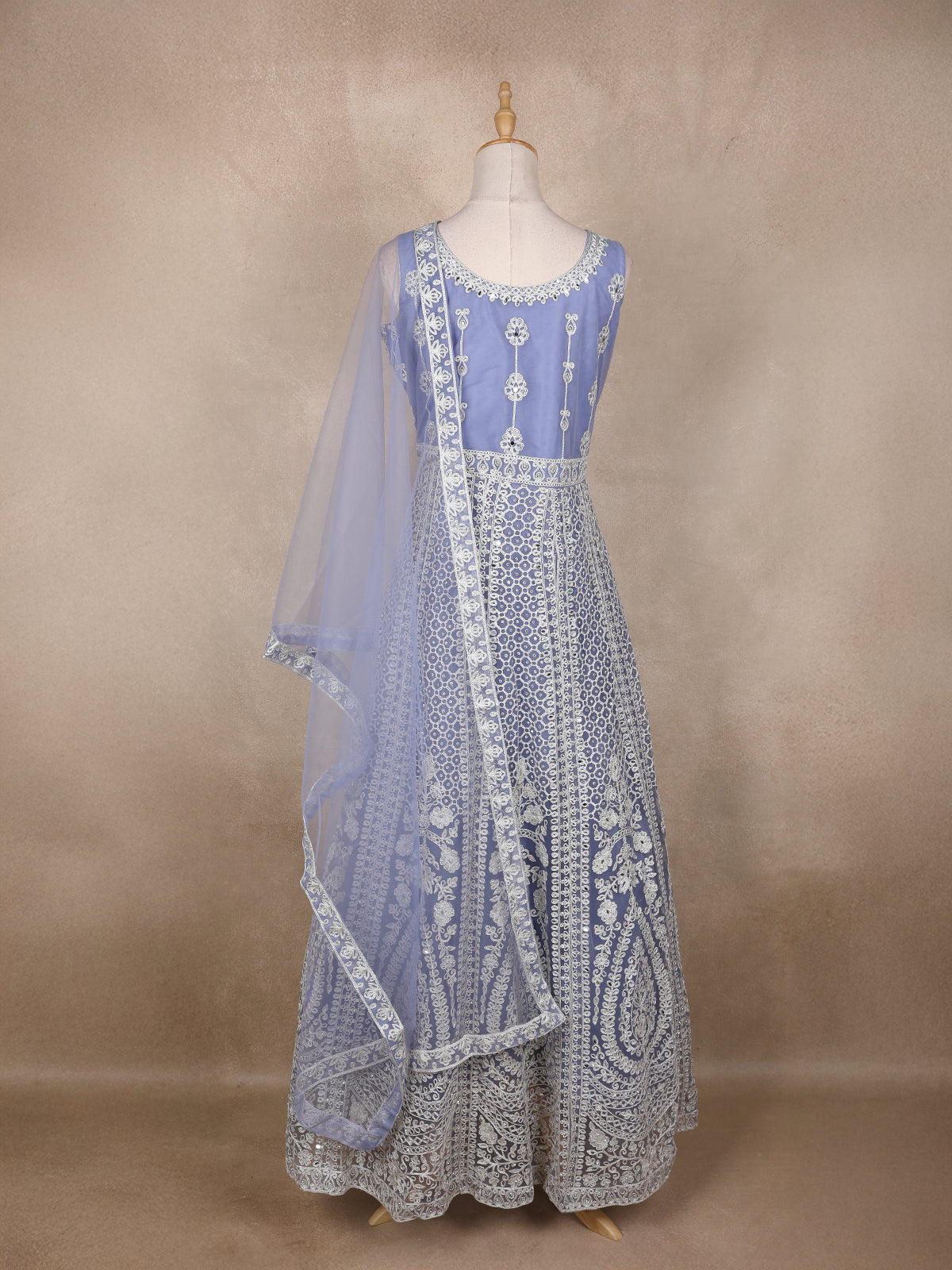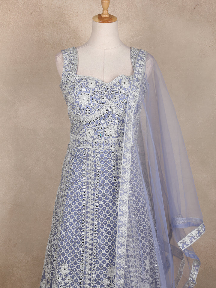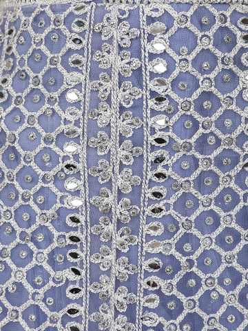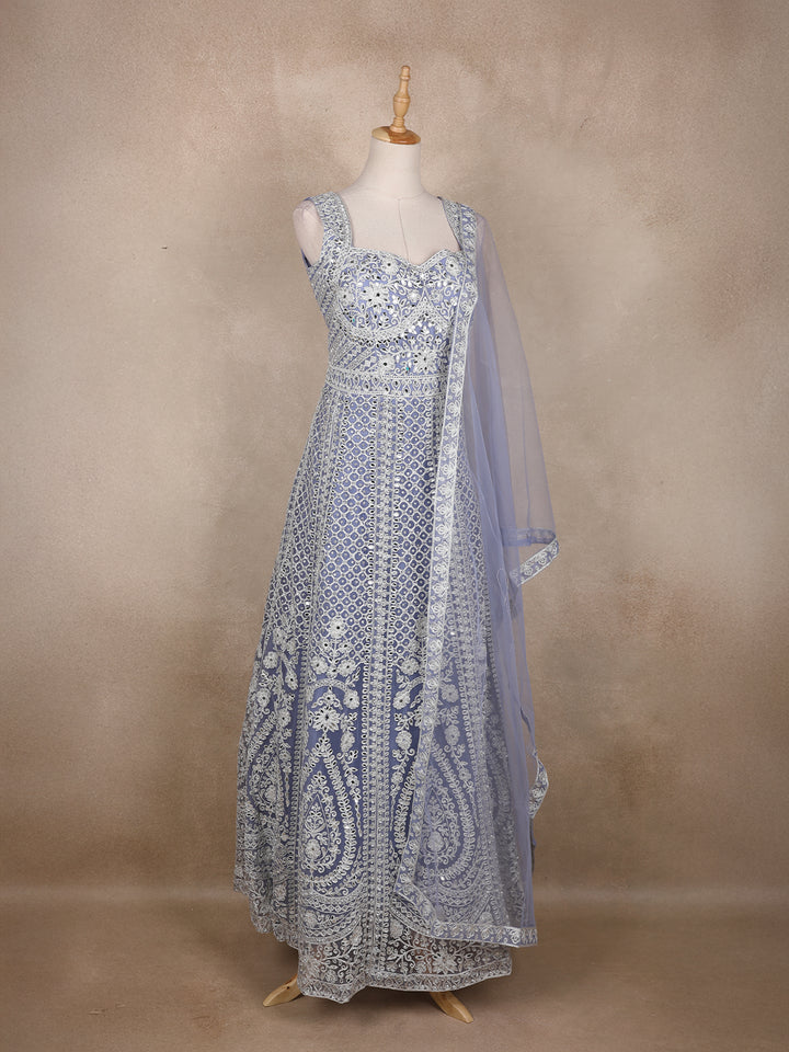 Step into a realm of elegance with this Steel Blue Geometric Embroidered Net Gown, a perfect harmony of sophistication and sparkle. Crafted from soft net fabric, this stunning gown features intricate geometric embroidery accentuated with shimmering sequins and mirror work, giving it a radiant, luminous appeal.