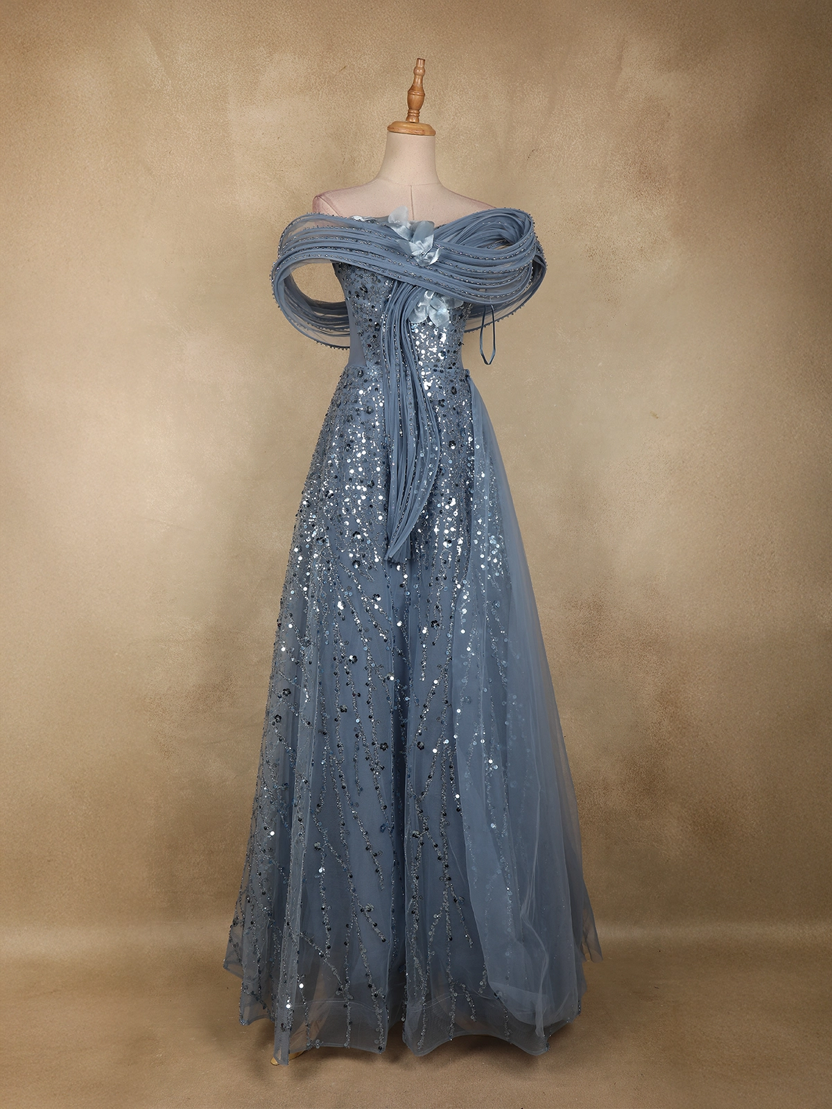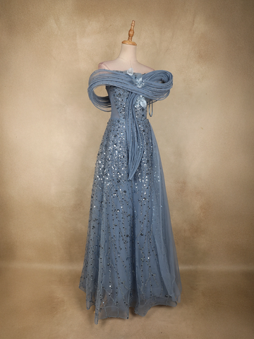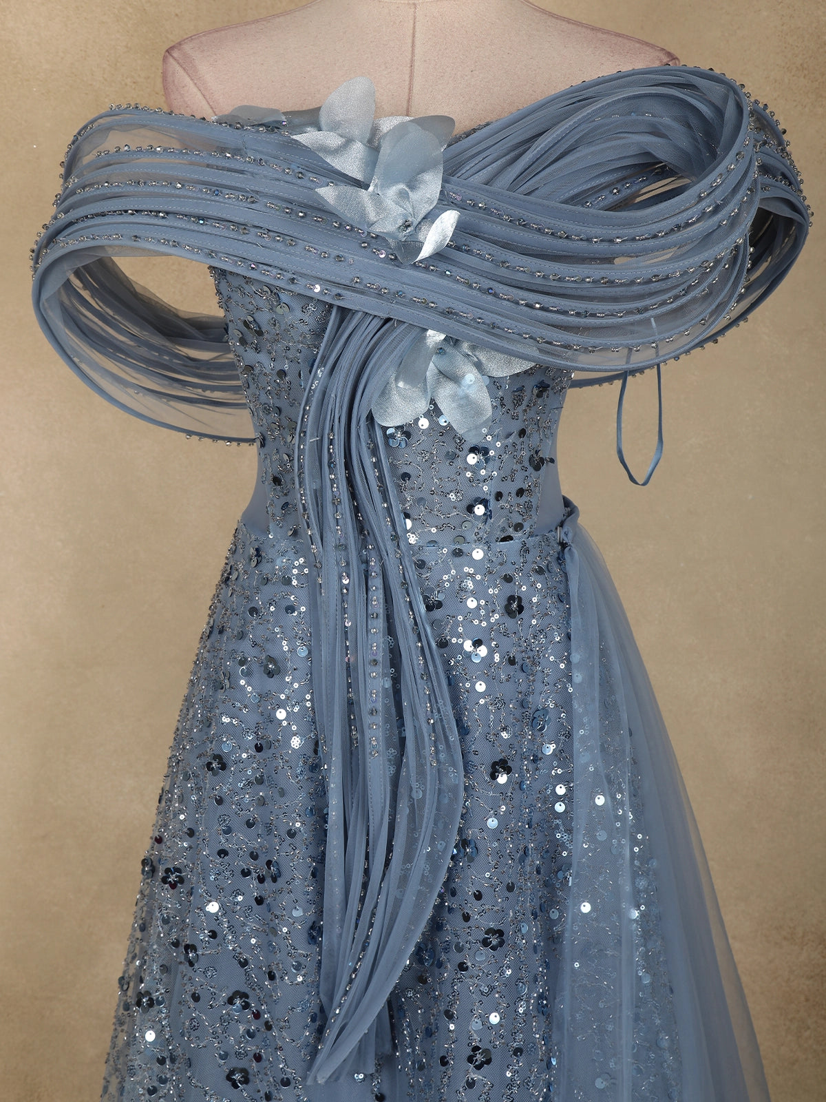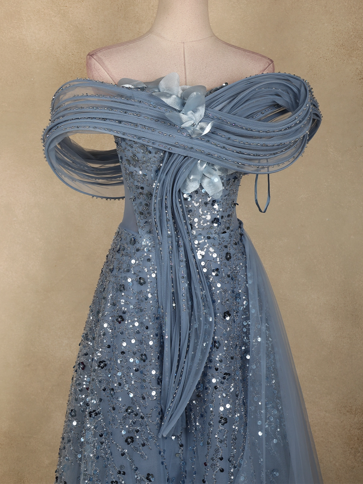 Steel Blue Heavy Sequins Embroidered Design Off-Shoulder Net Party Wear Gown