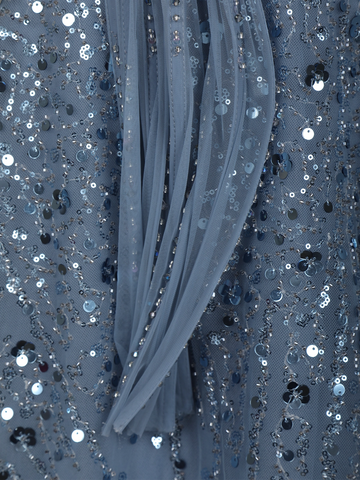 Step into effortless glamour with this Steel Blue Heavy Sequins Embroidered Design Off-Shoulder Net Party Wear Gown, crafted to make a striking statement at every celebration. Rendered in a sophisticated steel blue hue, this gown beautifully balances modern elegance with luxurious detailing.