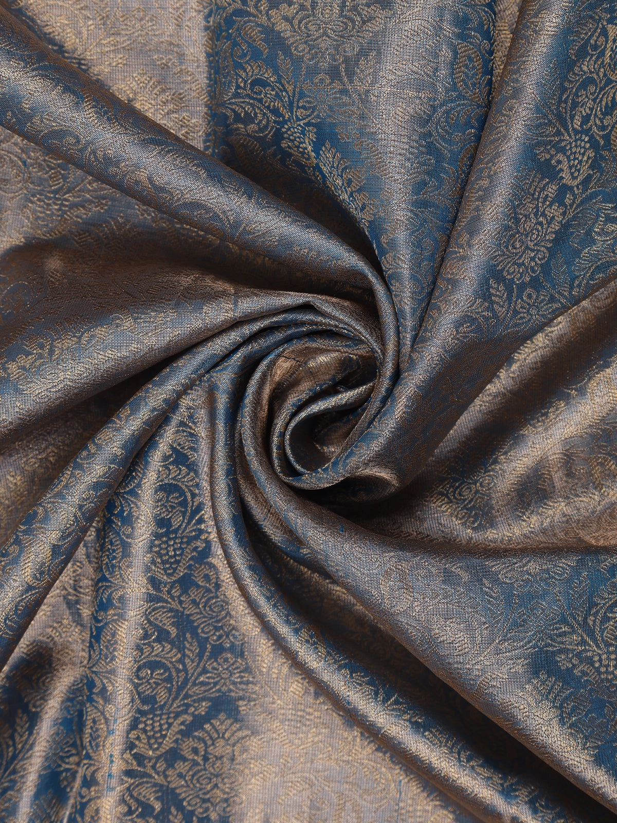 Draped in refined luxury, this Steel Blue Zari Woven Design Pure Tissue Silk Saree is crafted to bring a regal glow to every celebration. The lustrous tissue silk fabric offers a graceful sheen that beautifully catches the light, enhancing the elegant steel blue hue with every movement. Intricate zari woven patterns adorn the saree throughout, adding rich texture and an opulent touch. The look is further elevated by a stunning gold zari border, giving the drape a majestic finish that exudes tradition and grandeur. Perfect for weddings, receptions, festive occasions, and upscale celebrations, this saree ensures effortless sophistication. Pair it with traditional jewelry and a chic blouse for a timeless look that radiates elegance.