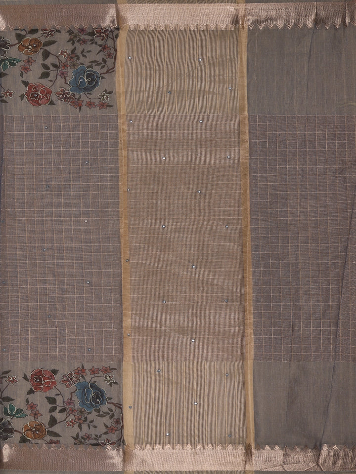 The body features a classic checked pattern enriched with delicate zari weaving, exuding understated charm and artisanal precision. The matching grey pallu and blouse keep the look cohesive, while the zari border adds a regal glimmer — perfect for festive occasions where grace meets simplicity.
