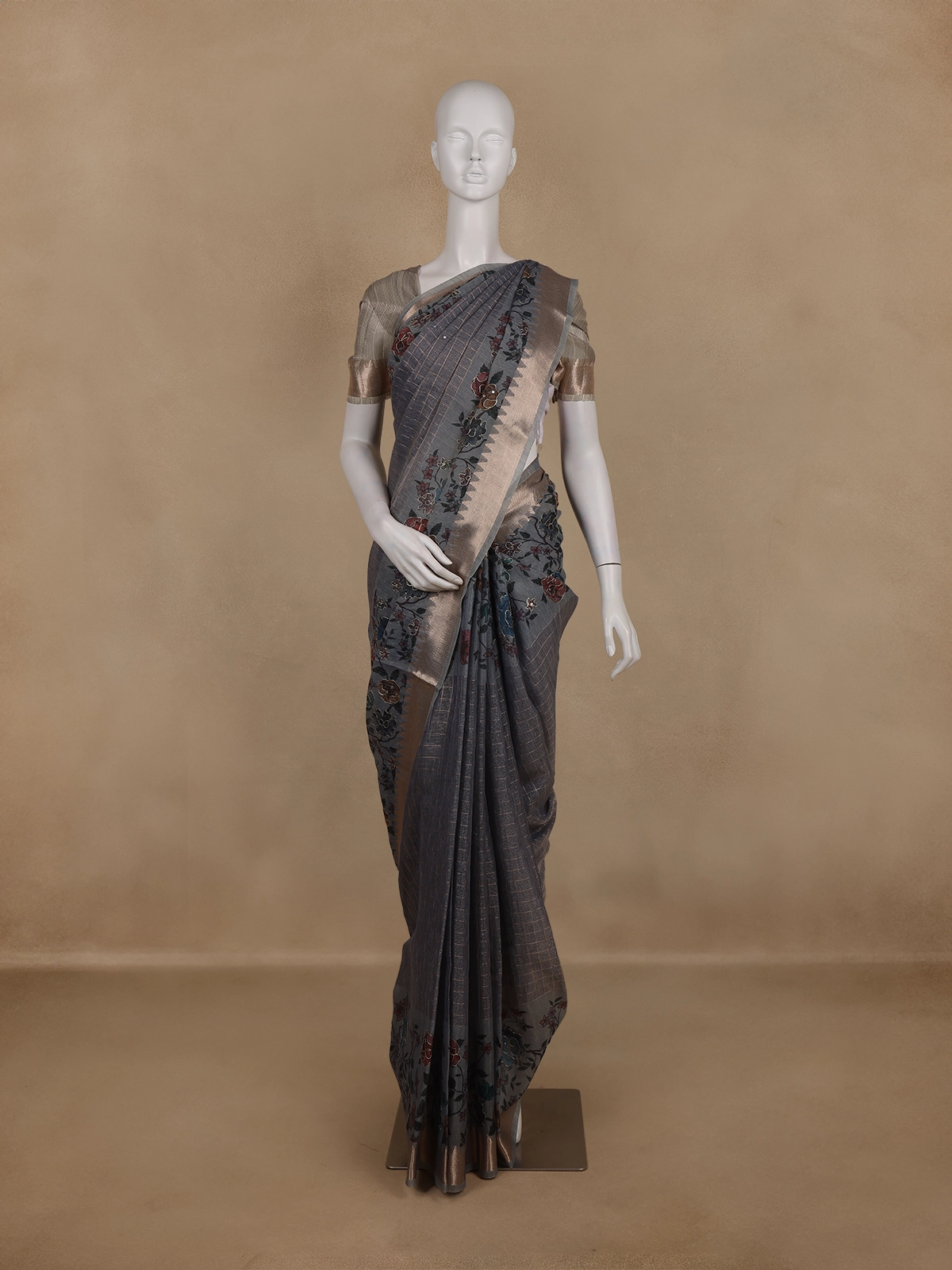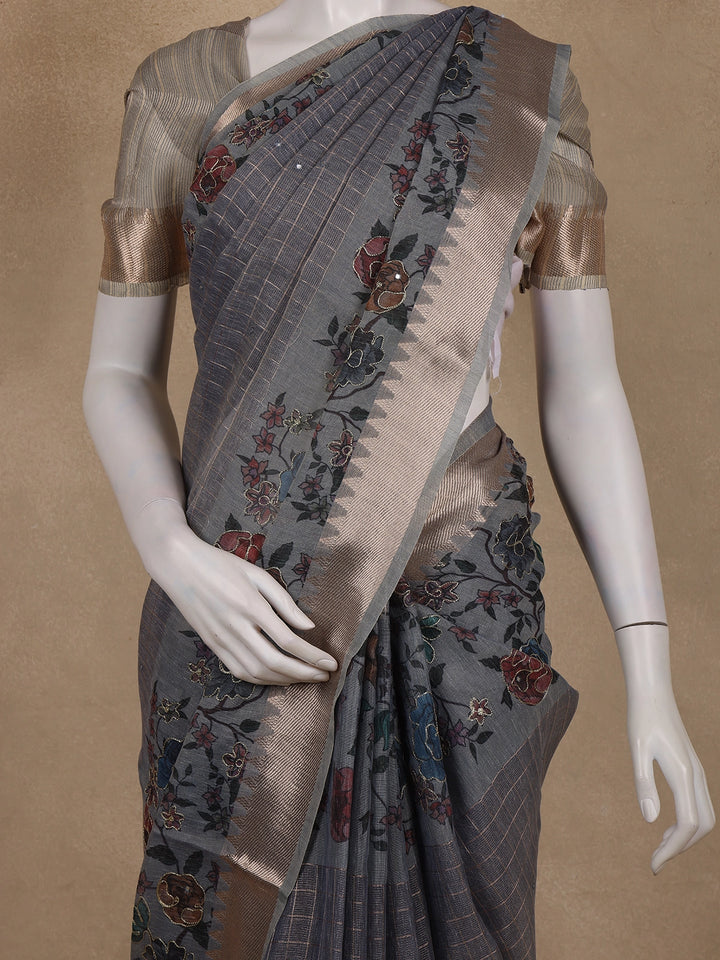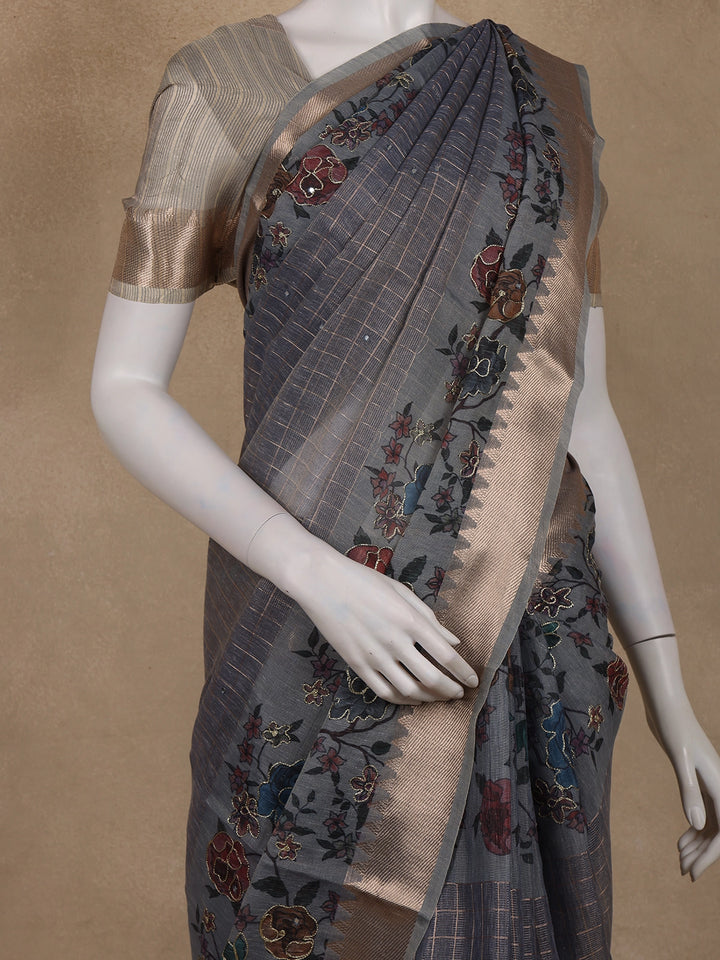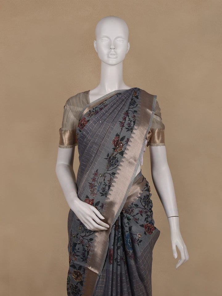 Steel Grey Floral Printed Design Tussar Silk Saree