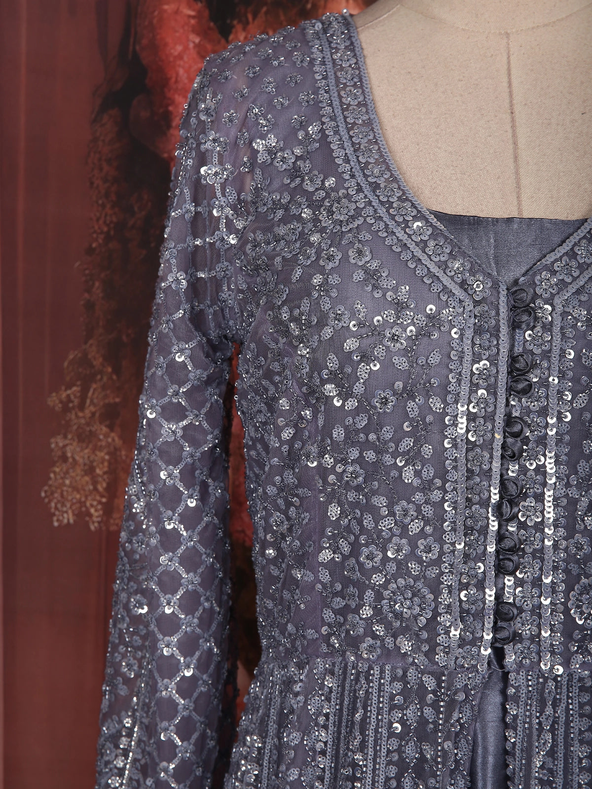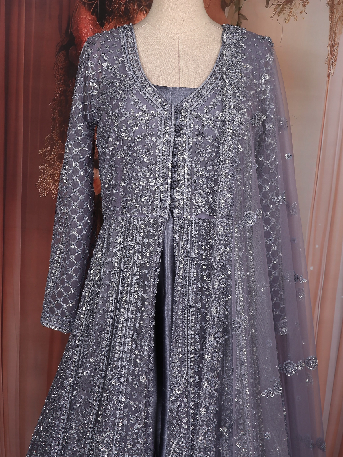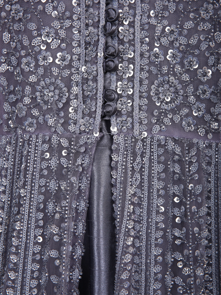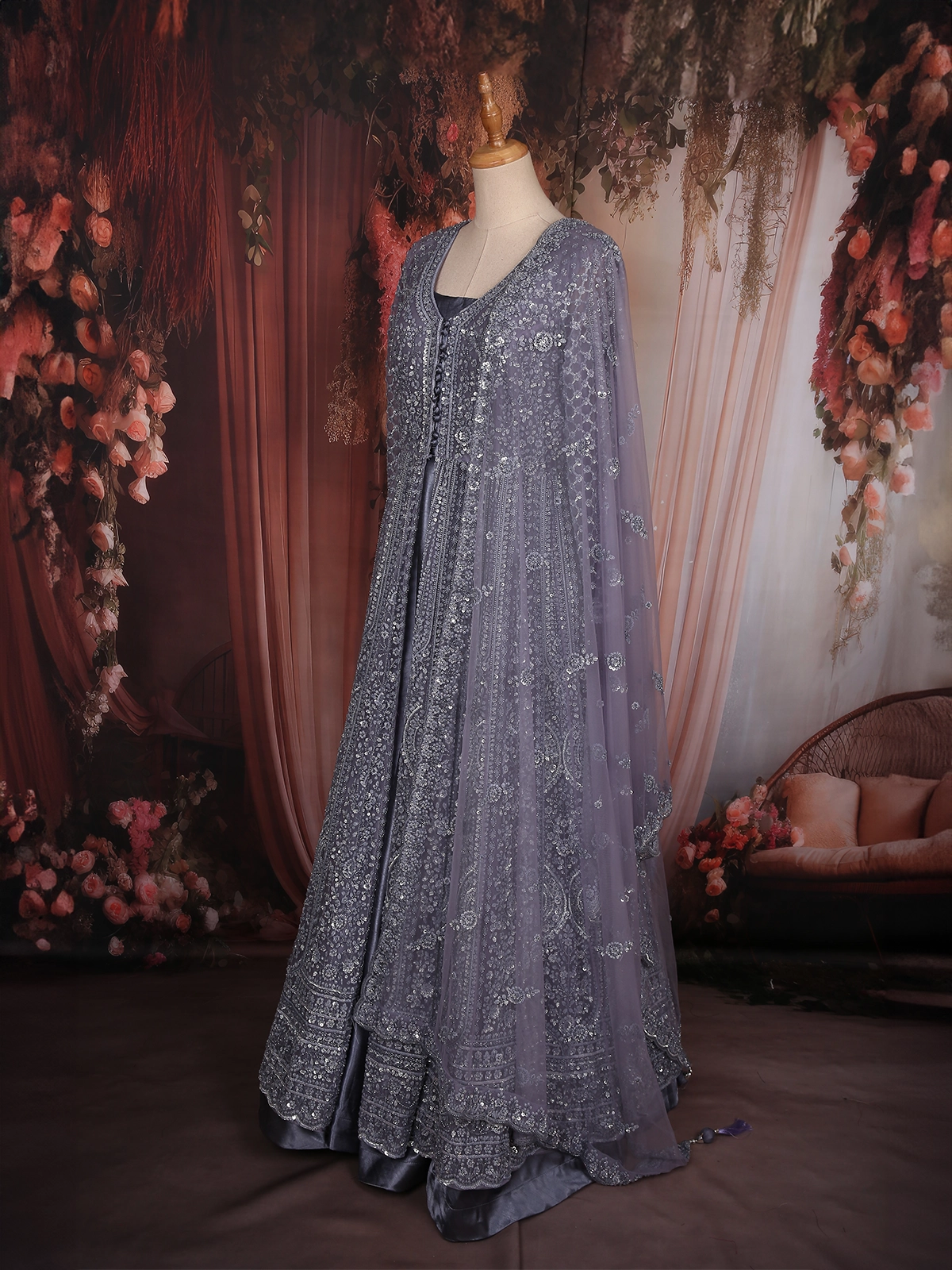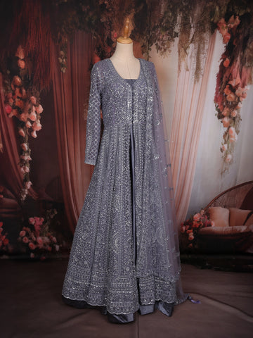 Make a breathtaking entrance in this opulent Steel Grey Engagement Gown, designed to reflect sheer elegance and regal charm. Crafted with meticulous attention to detail, the gown features luxurious all-over embroidery enriched with shimmering sequins and intricate threadwork — creating a stunning textured brilliance from top to hem.