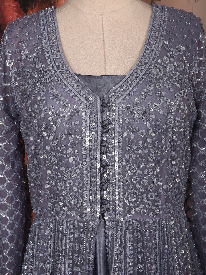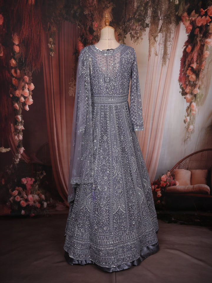 Steel Grey Heavy Sequins and Thread Embellished Design Net Engagement Gown with Net Dupatta