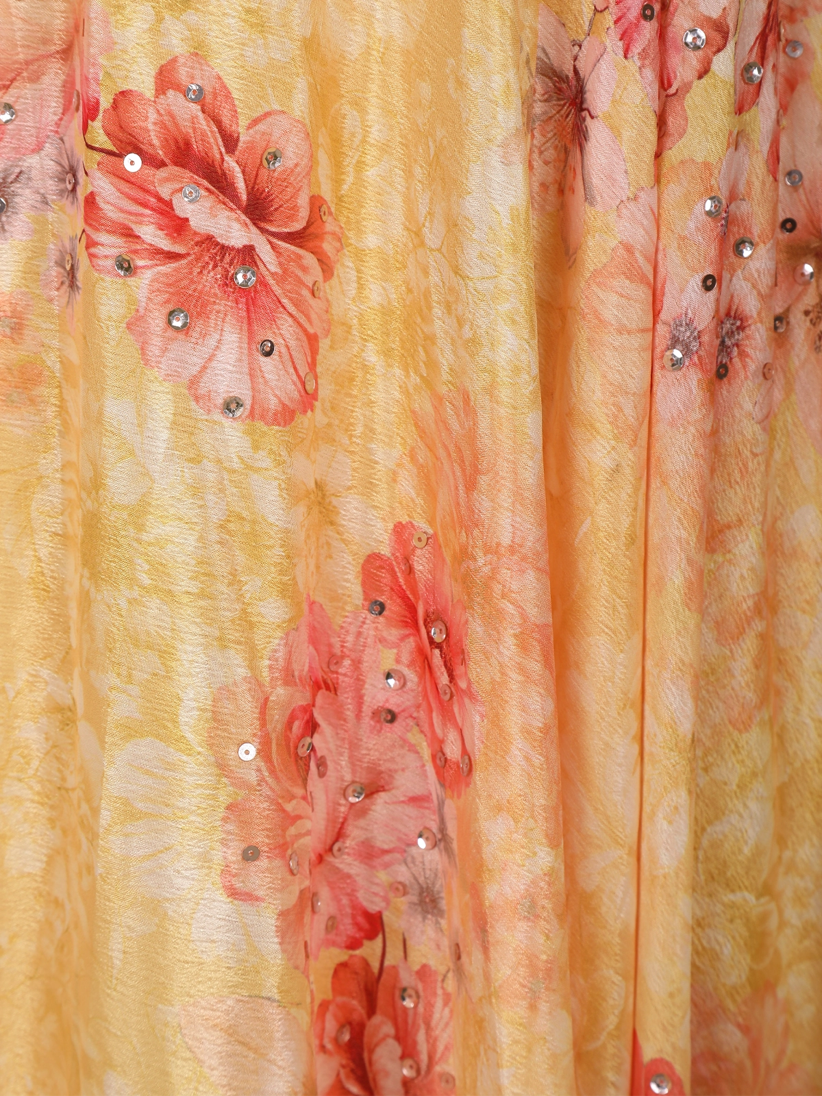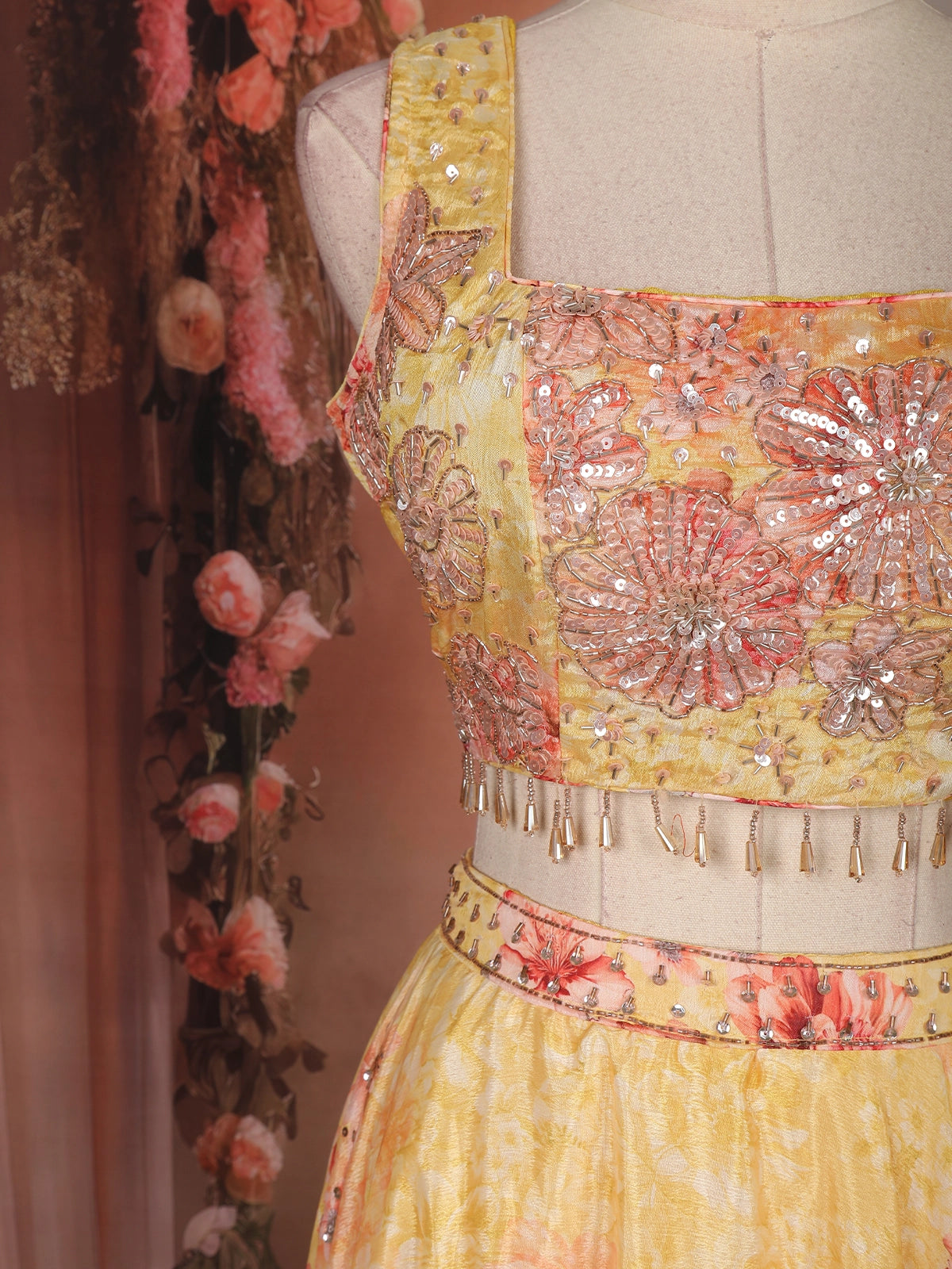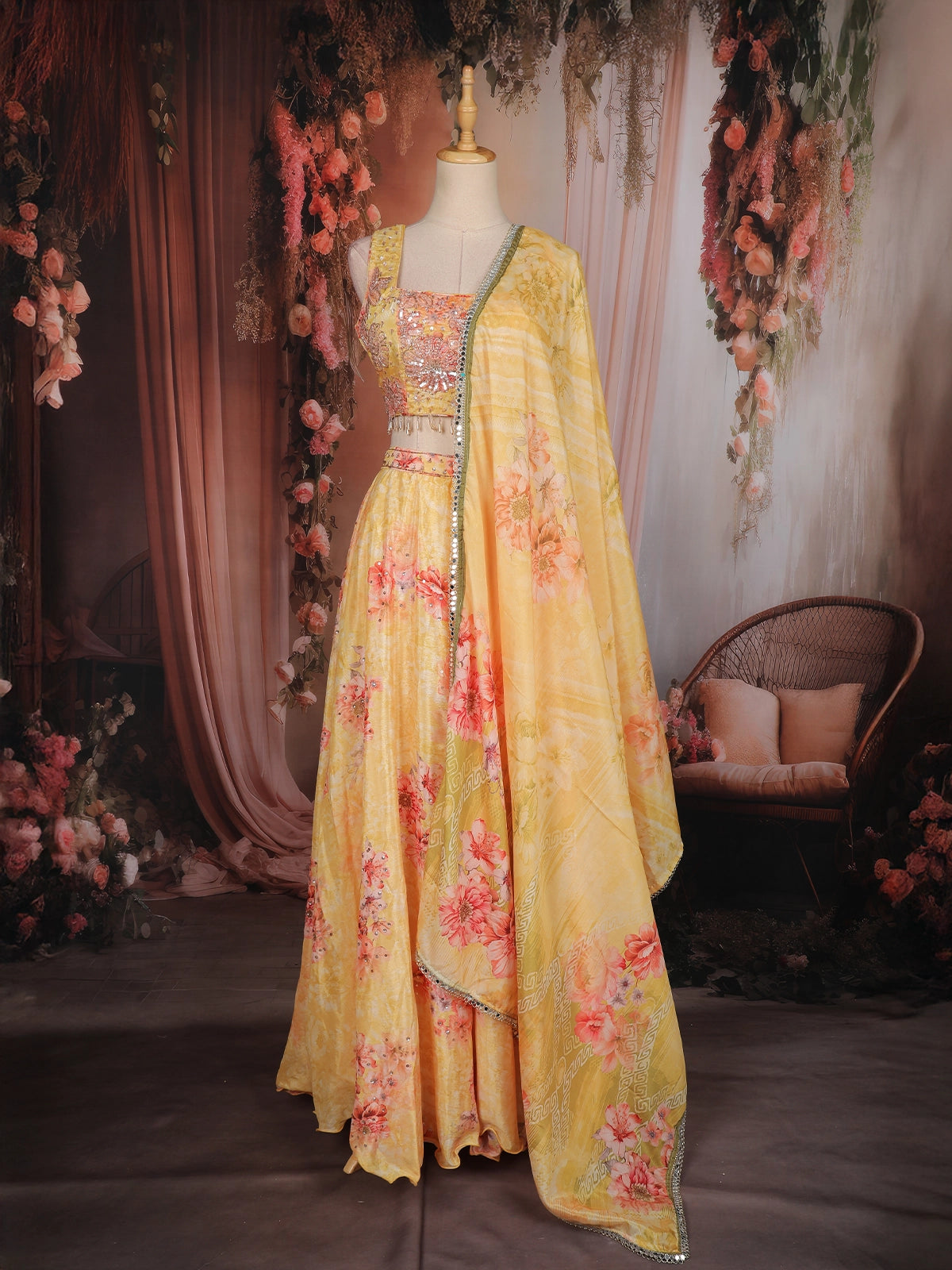 Sunshine Yellow Floral Print and Thread Embroidered Design Organza Lehenga