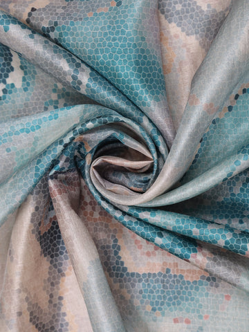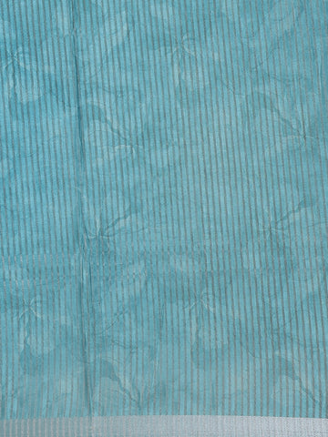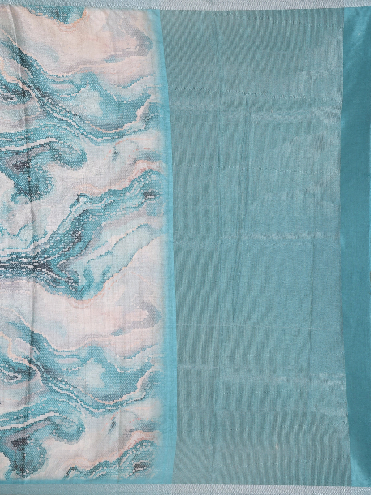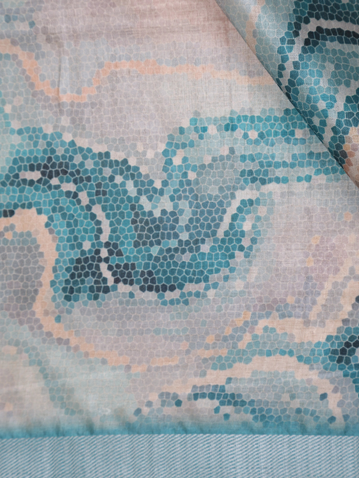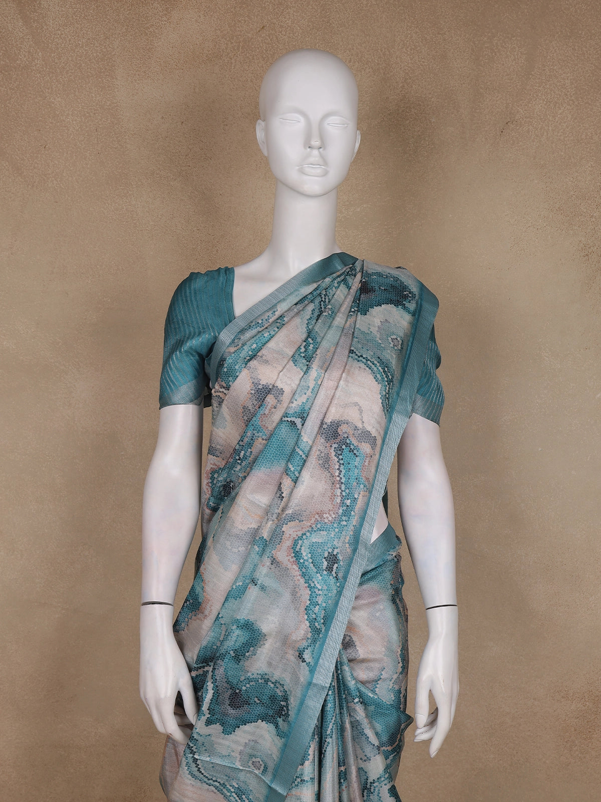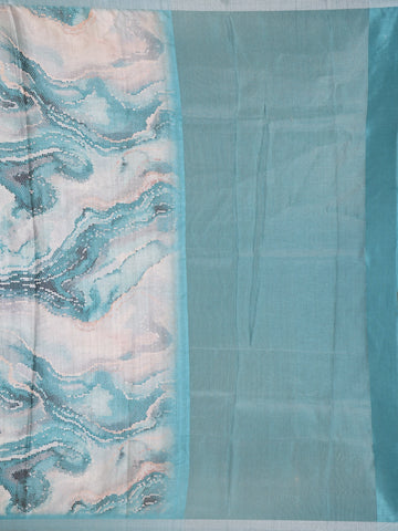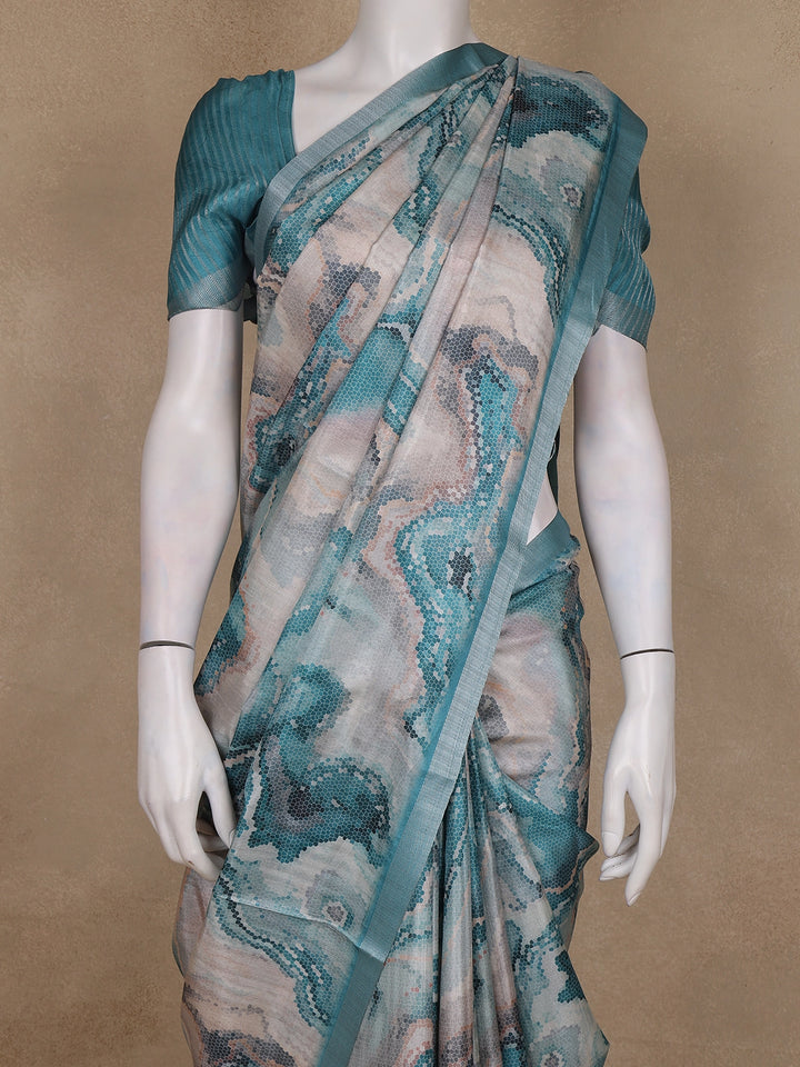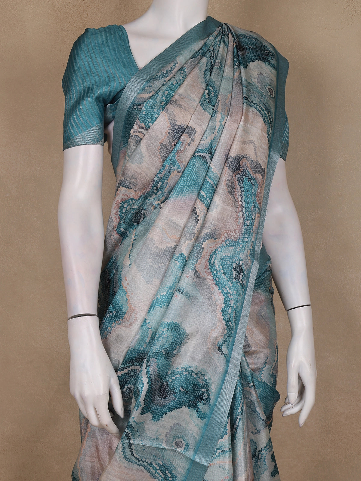 Teal Blue and Beige Abstract Printed Design Tussar Saree with Zari Border