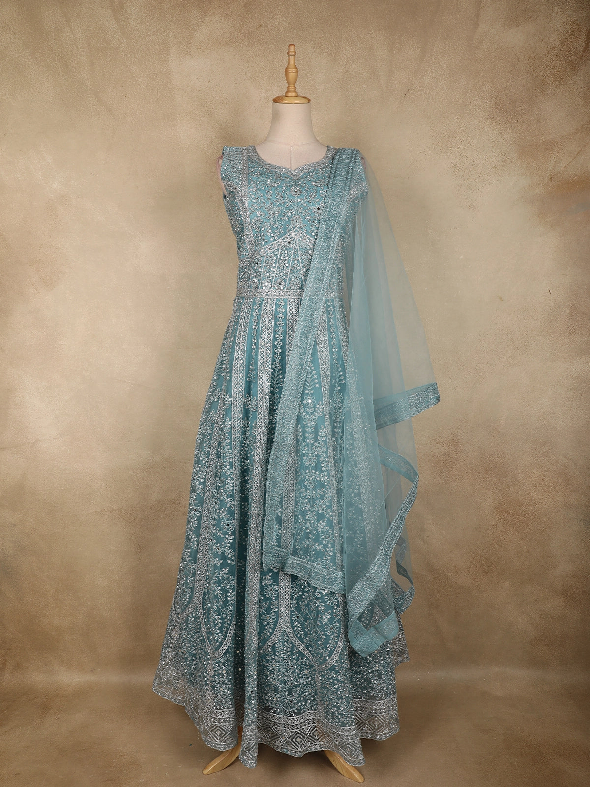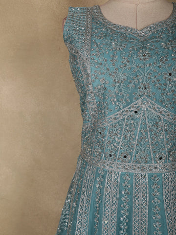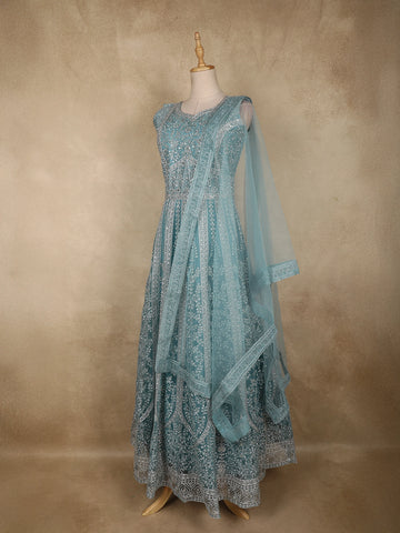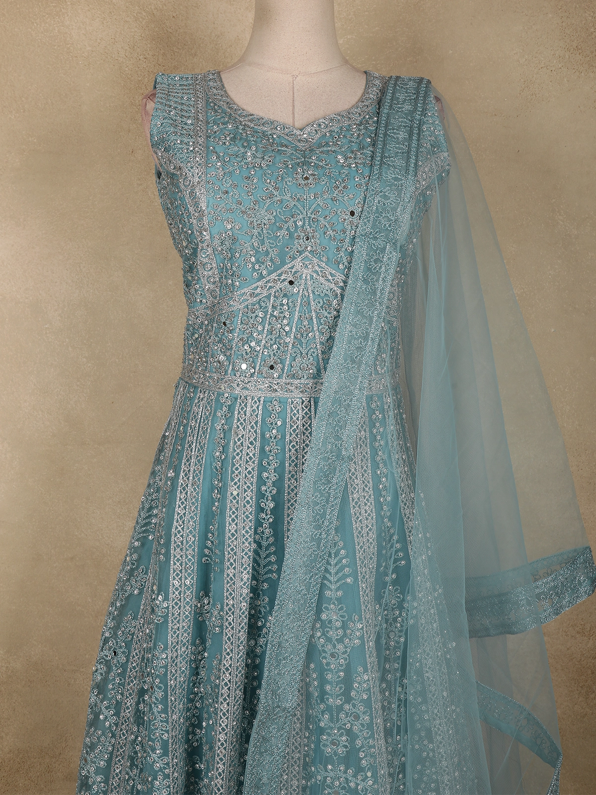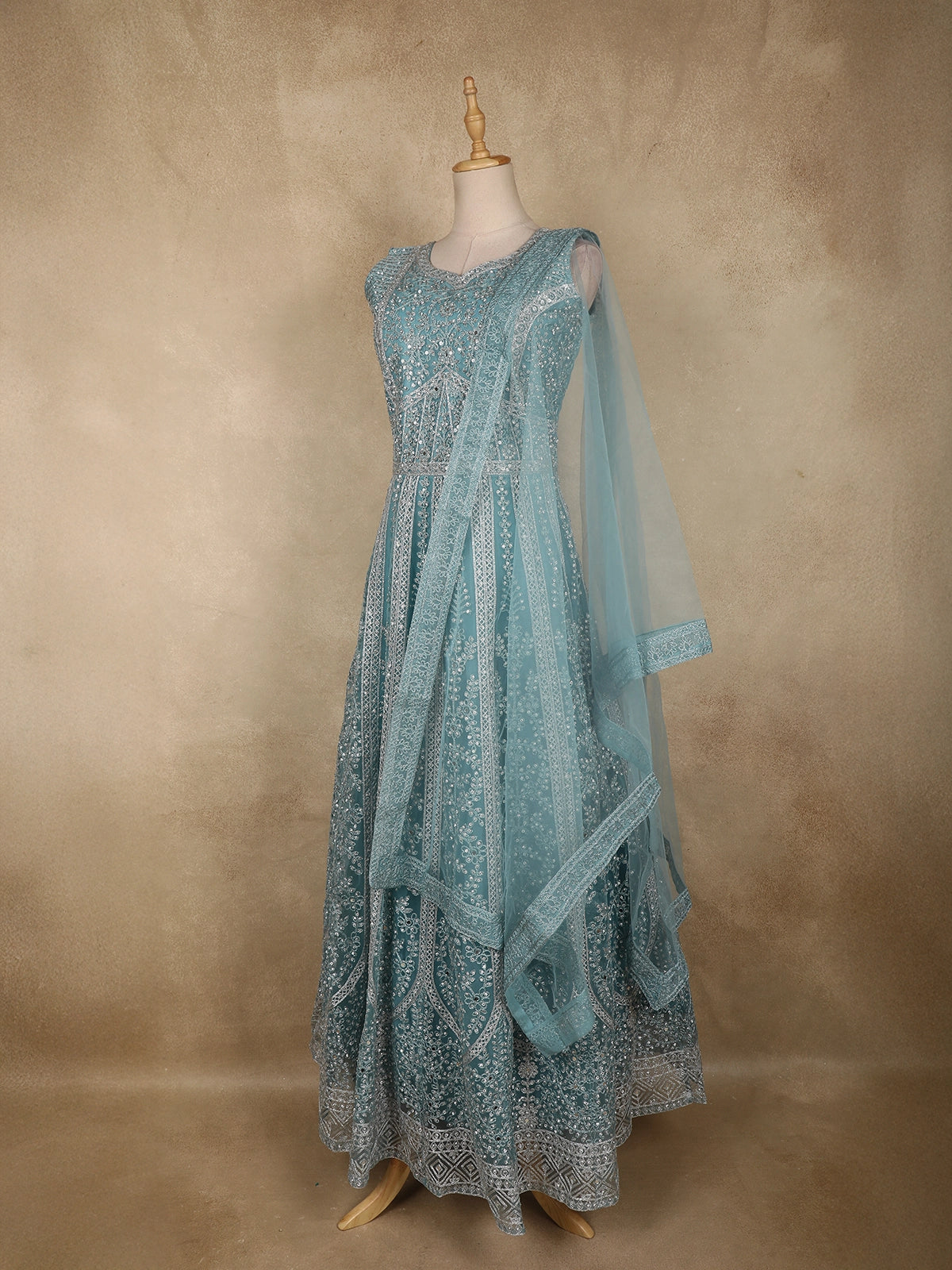 Teal Blue Beads and Sequins Embroidered Design Net Bridesmaid Gown