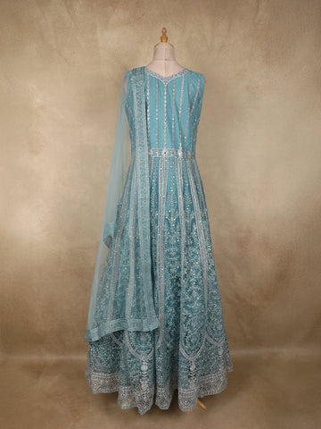 Designed with a flattering fitted bodice and a flowy, floor-length silhouette, this gown offers effortless grace and movement. The embroidered patterns extend seamlessly towards the hemline, finished with ornate detailing that elevates its luxurious appeal. A matching net dupatta with subtle embroidery completes the ensemble, adding a soft, sophisticated touch.