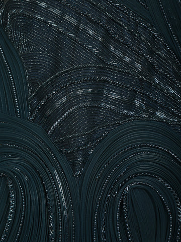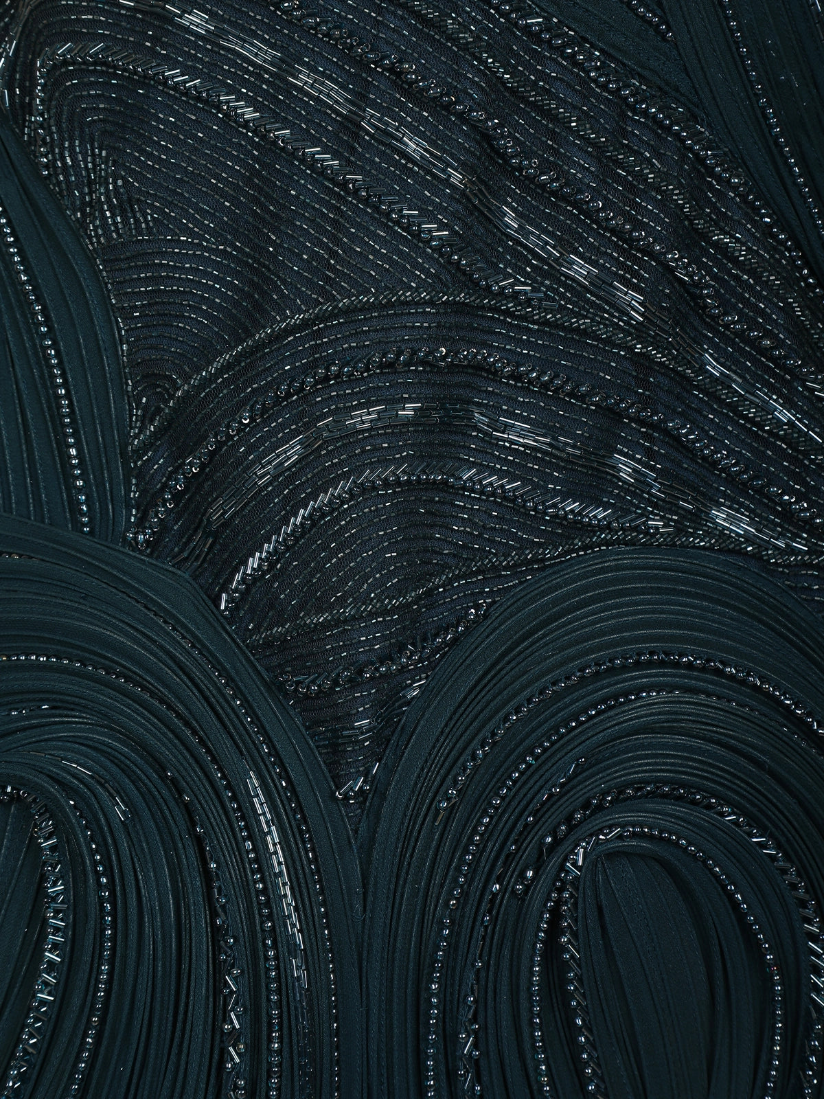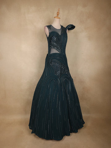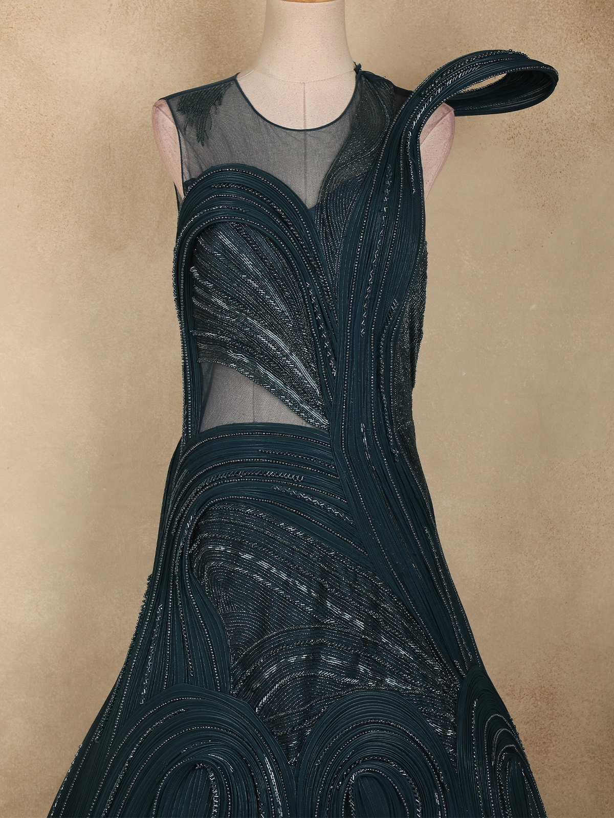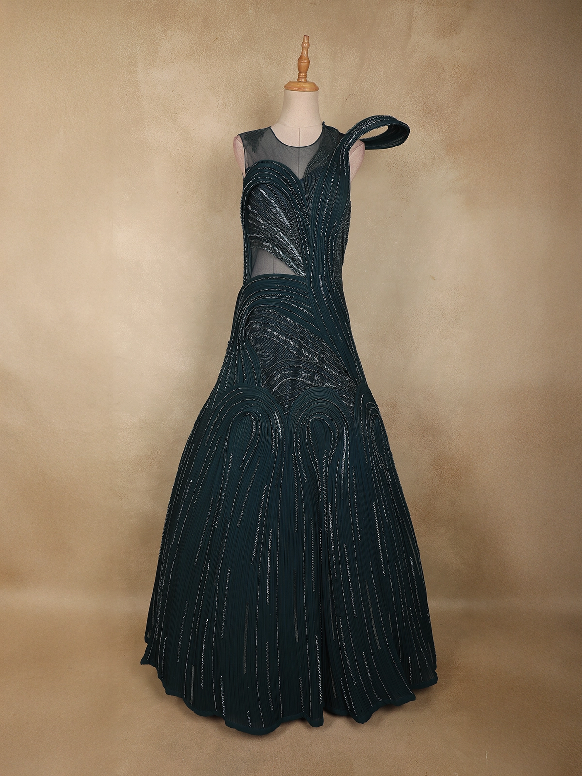 The gown is beautifully tailored in soft net, featuring an exquisite cascade-inspired design accentuated with meticulously placed beads and fine shimmer detailing. The flowing linear patterns curve gracefully across the bodice and skirt, creating a dramatic wave effect that enhances the gown’s depth and dimension. The rich teal blue hue adds a luxurious intensity, making the ensemble striking yet refined.