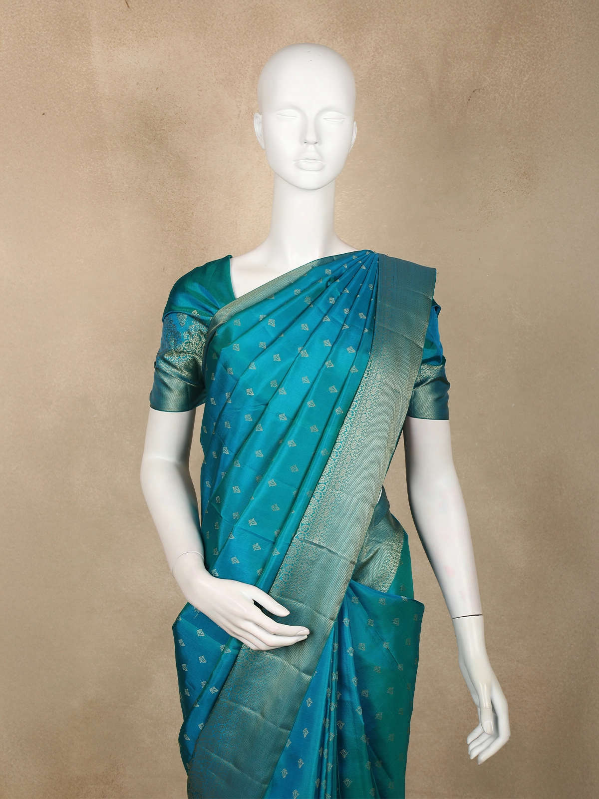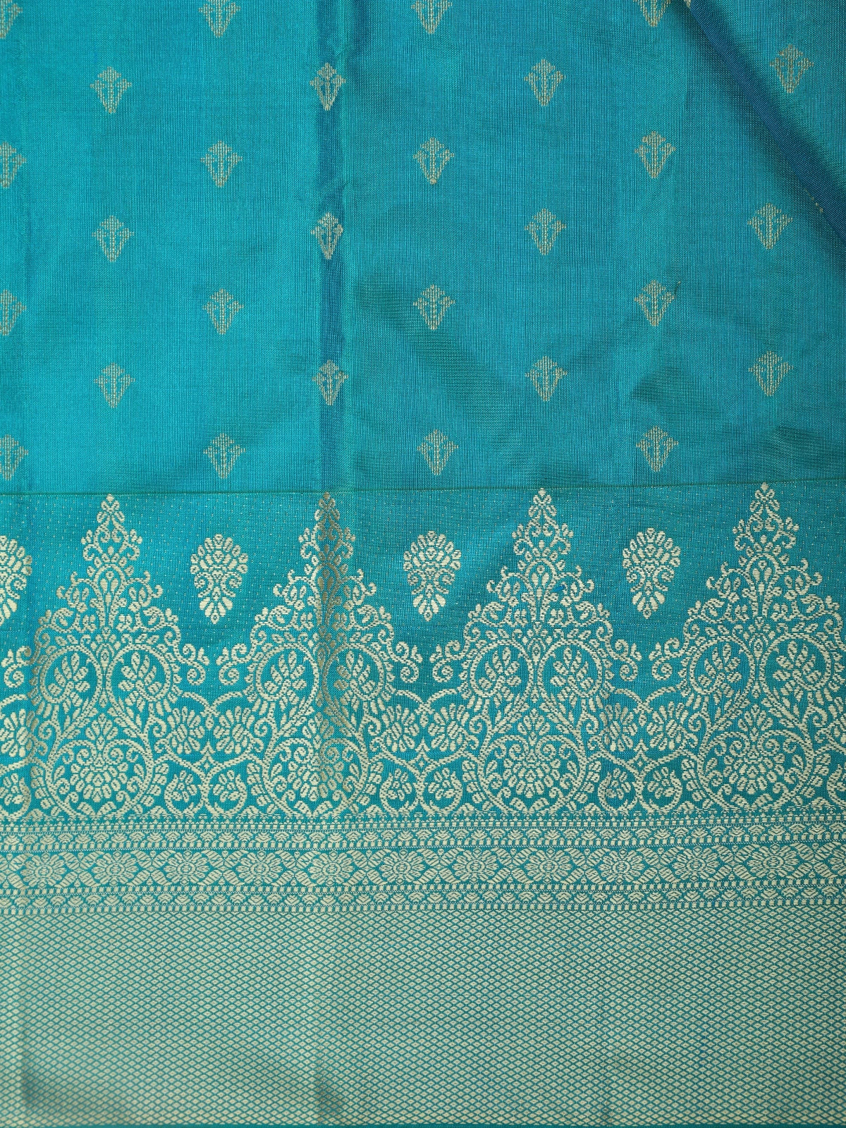 The saree features an all-over gold butta woven pattern, delicately arranged to complement the deep teal blue tone. The interplay of the shimmering motifs against the lush silk creates a regal visual appeal, ideal for weddings, festive celebrations, and traditional functions.