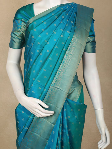 Teal Blue Butta Woven Design Kanchipuram Silk Saree with Contrast Gold Zari Border