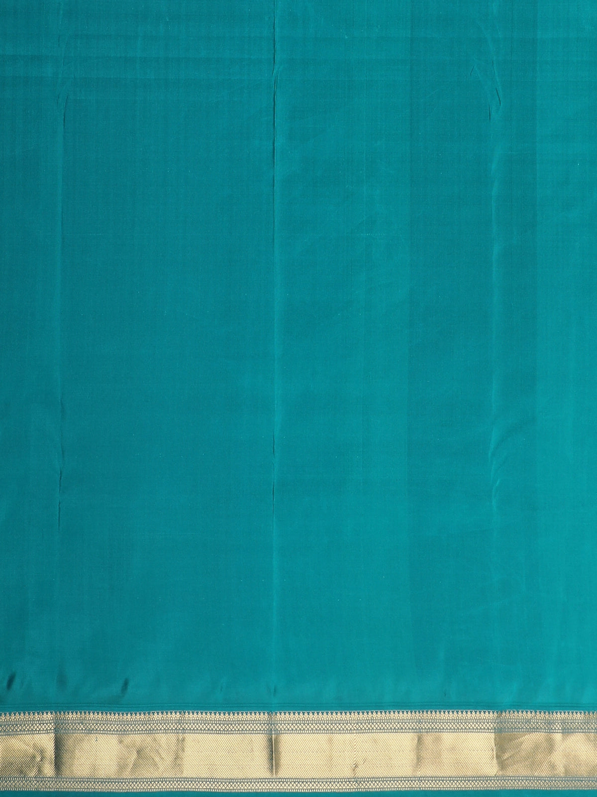 Completing the ensemble is the striking contrast teal blue zari border, intricately woven with gold patterns that elevate the overall richness. The pallu continues this artistry with elaborate zari work that adds drama and grandeur to the drape. Paired with a matching teal blue zari-bordered blouse, this saree is designed to make a powerful, elegant impression.