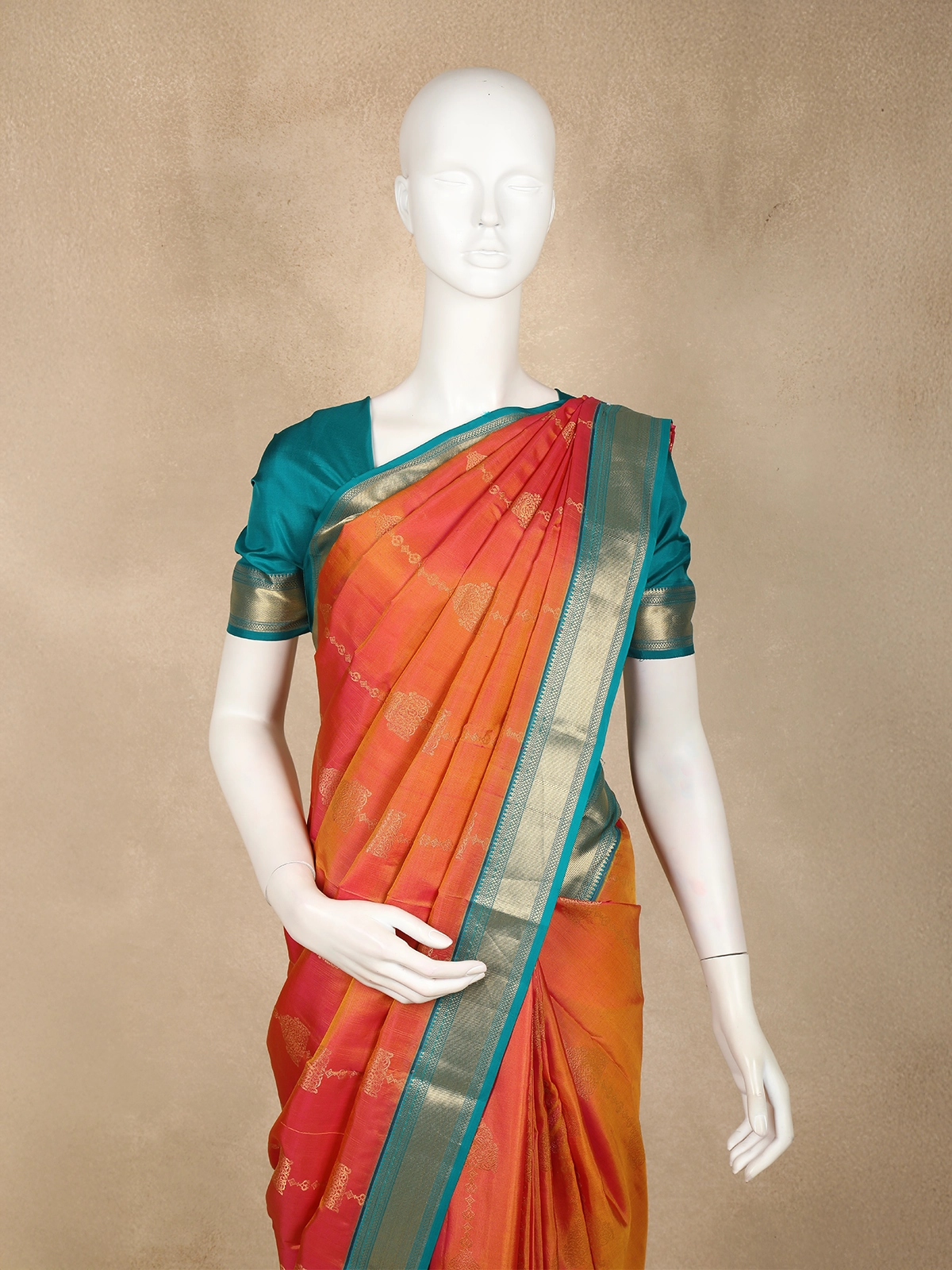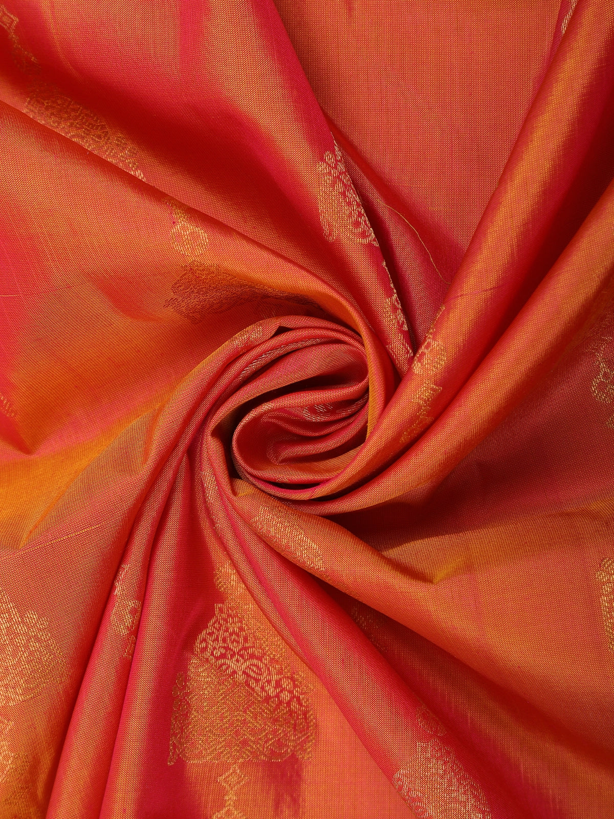 The body features a mesmerizing dual-tone effect, shifting beautifully between warm orange and soft pink as the light falls on it. Subtle striped woven detailing adds depth, while lustrous gold butta motifs adorn the saree, lending a regal, traditional charm. The color symphony creates a radiant festive aura, perfect for weddings and grand occasions.