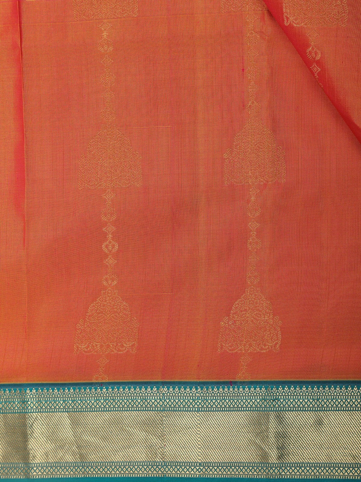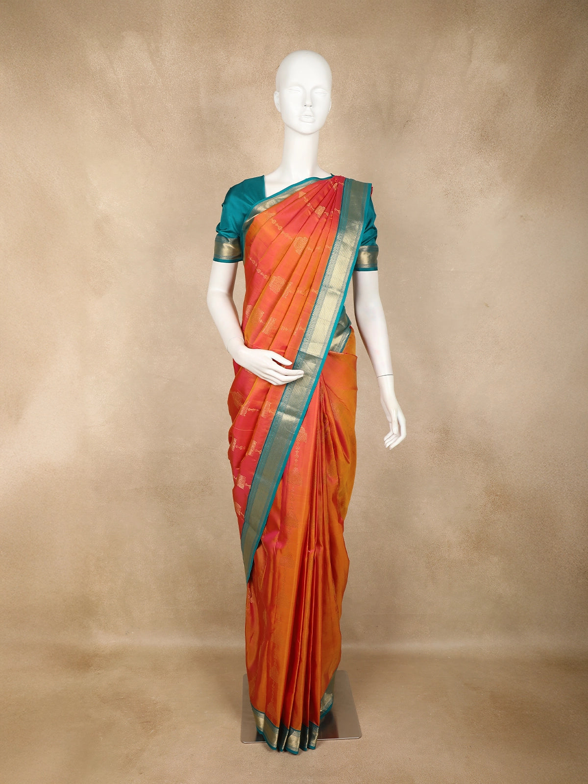 Orange and Pink Dual-Tone Striped Woven Design Kanchipuram Silk Saree with Contrast Teal Zari Border