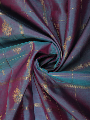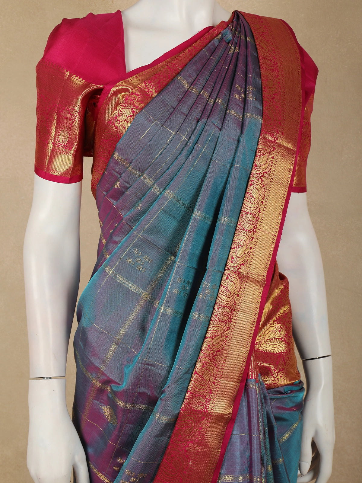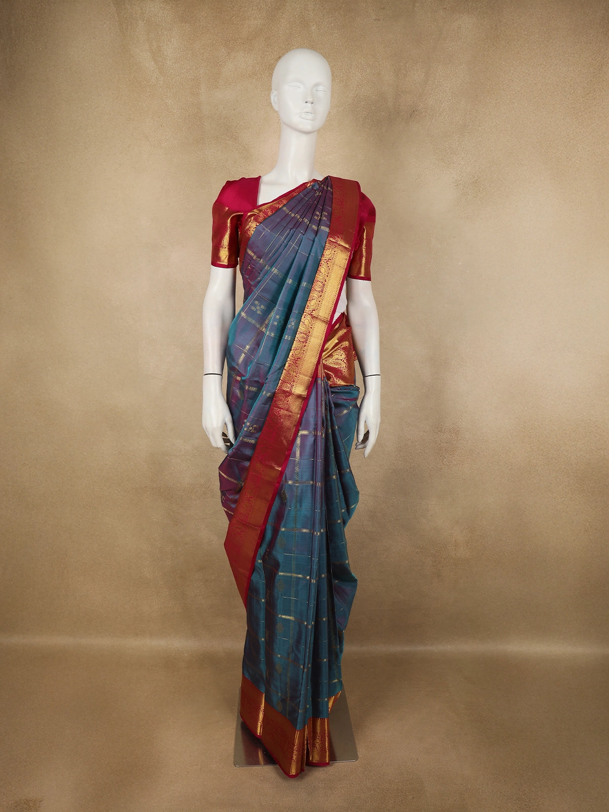 Teal Blue Checked Zari Woven Design Pure Kanchipuram Silk Saree with Contrast Zari Border