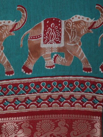 Teal Blue Elephant Printed Design Chanderi Cotton Saree with Contrast Zari Border