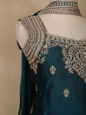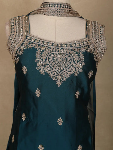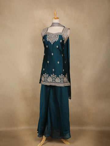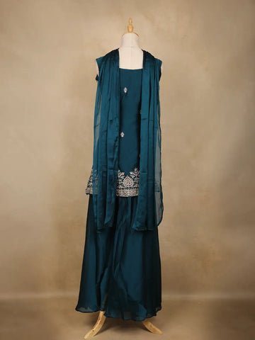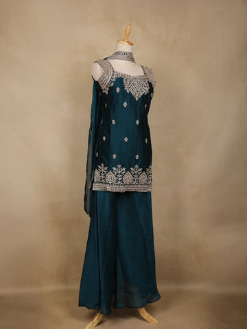 Teal Blue Embroidered Design Chiffon Palazzo Suit
