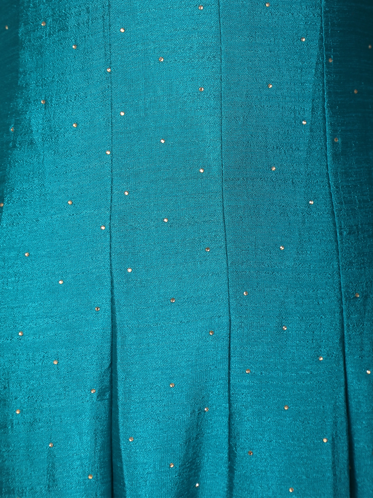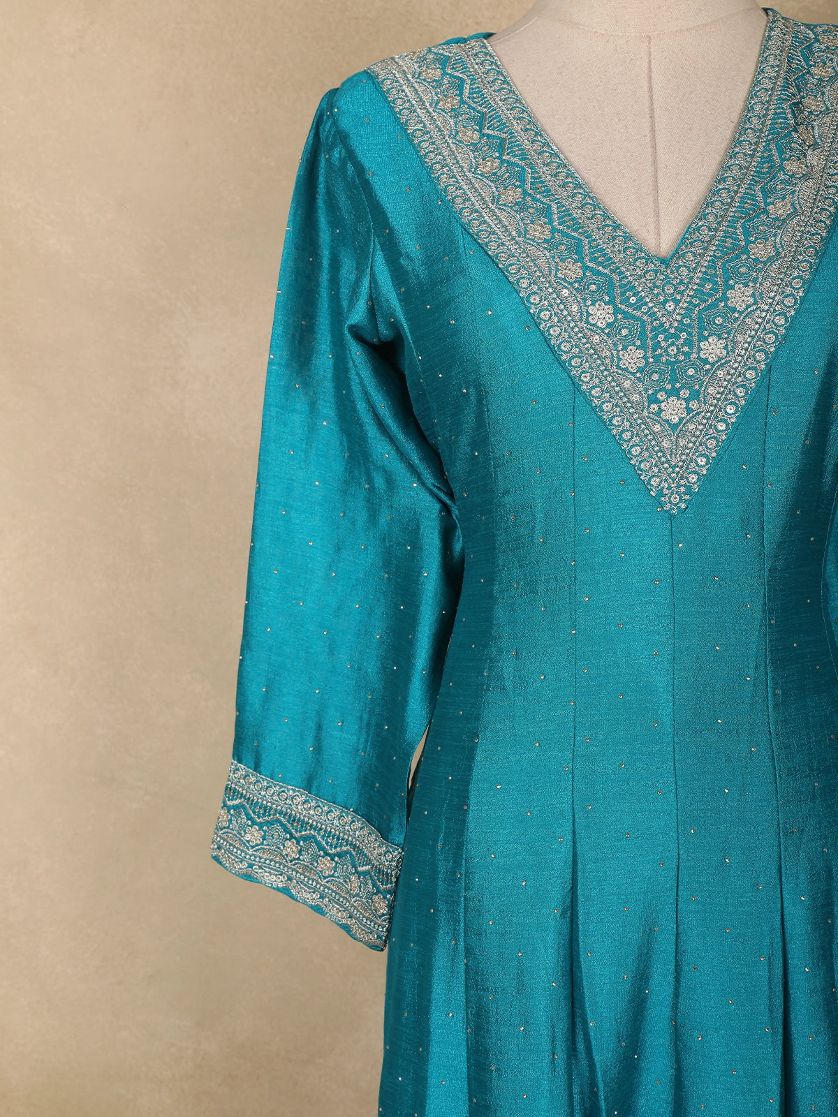 Elevate your ethnic wardrobe with this graceful teal blue Anarkali salwar suit, crafted in a rich georgette fabric that offers a soft sheen and elegant fall. The kurta features a flattering V-neckline adorned with intricate silver-toned thread and zari embroidery, beautifully highlighting the yoke with delicate floral and geometric detailing. Subtle dotted accents across the body add a refined sparkle, enhancing the overall festive appeal.