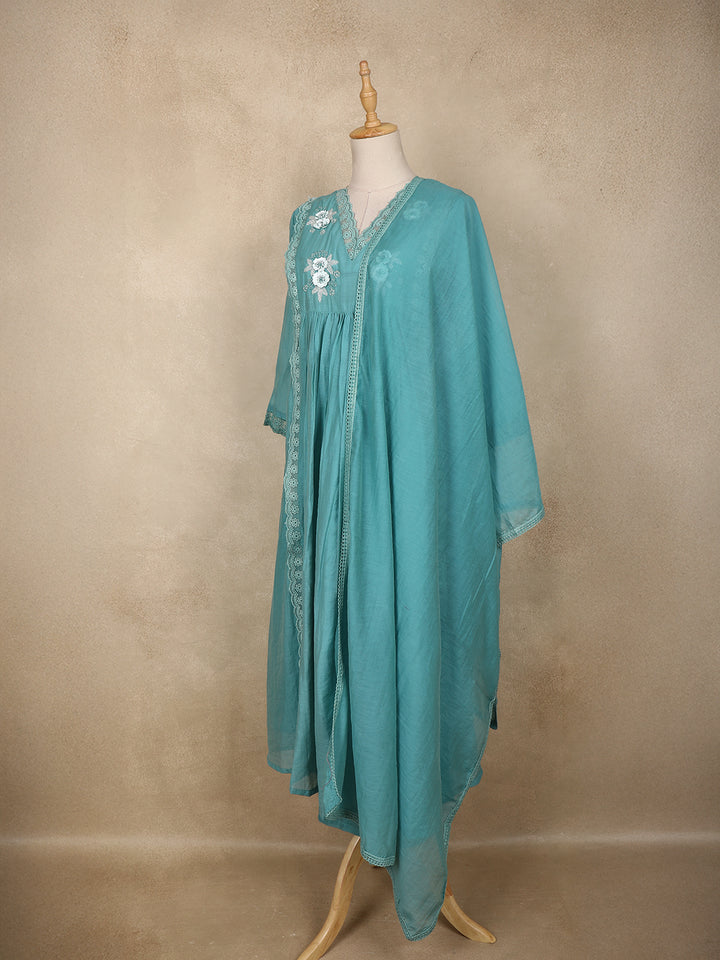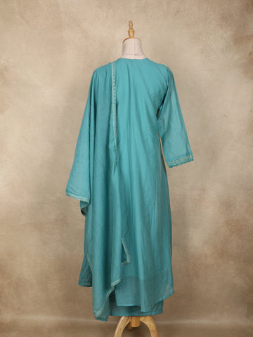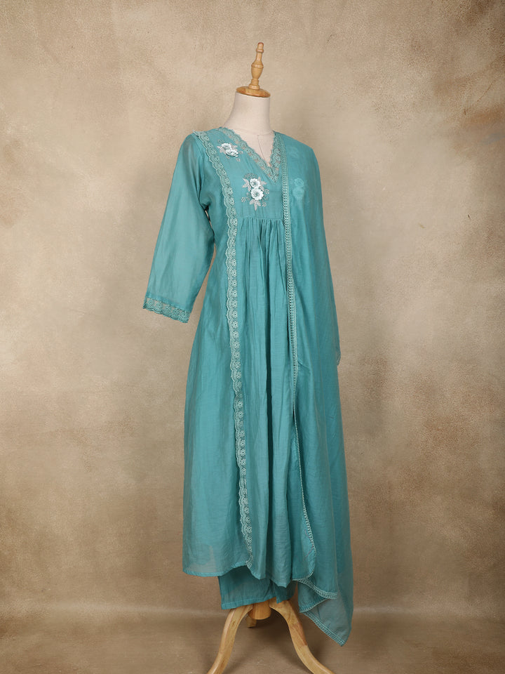 Teal Blue Floral Appliqué Embroidered Cotton Salwar Suit with Scallop Lace