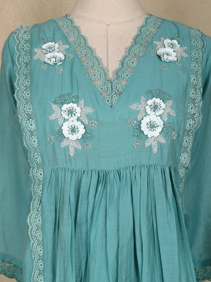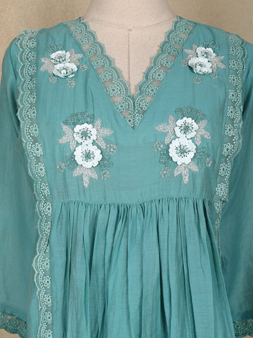 Intricate floral embroidery with 3D appliqué and sequin detailing adds a touch of sophistication and shimmer, perfect for celebrating special yet subtle moments. The soft cotton fabric ensures breathable comfort, making it ideal for all-day wear.