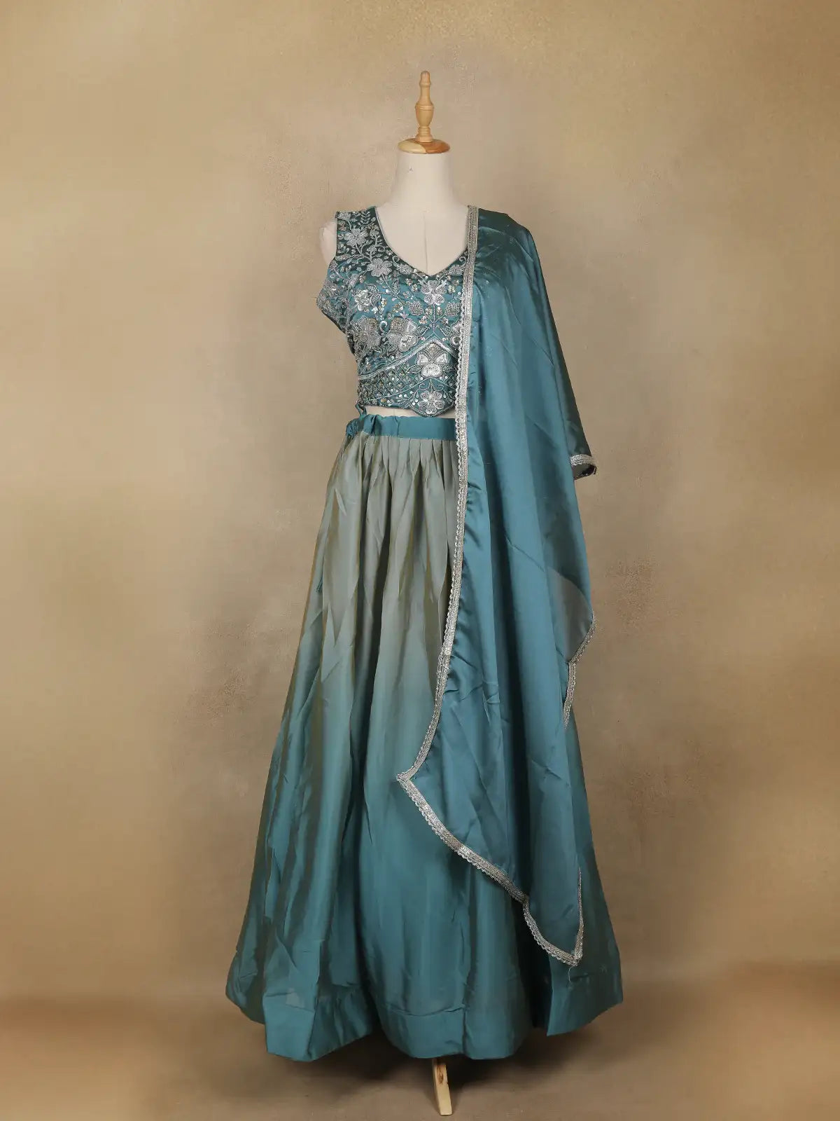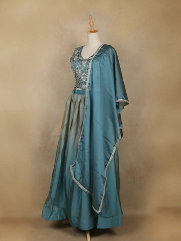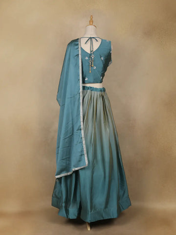 Teal Blue Floral Design Satin Lehenga with Dupatta