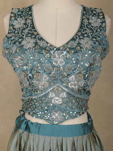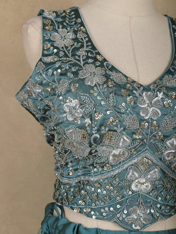 Step into elegance with this stunning teal blue silk blend lehenga set, crafted to make every celebration special. The sleeveless blouse is intricately adorned with floral embroidery, shimmering sequins, and zari highlights, creating a luxurious play of sparkle and texture. Its deep V-neckline adds a graceful charm, perfectly balancing tradition with contemporary finesse.