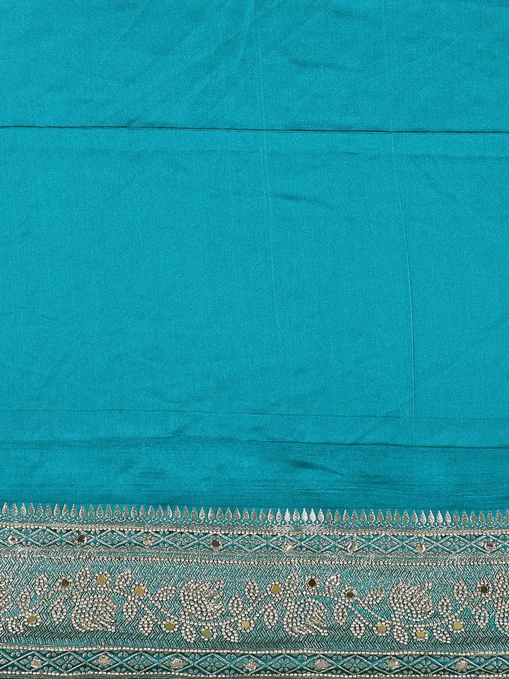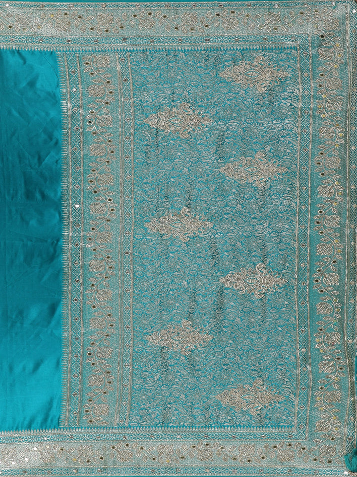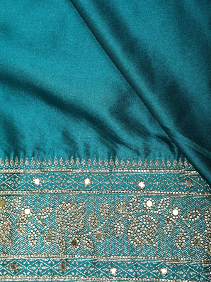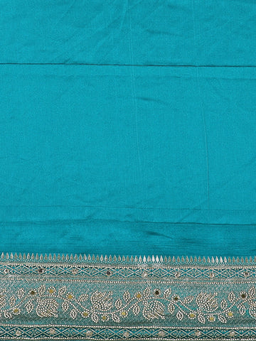 Teal Blue Floral Embellished Design Satin Saree with Heavy Stone Work and Designer Embroidered Border